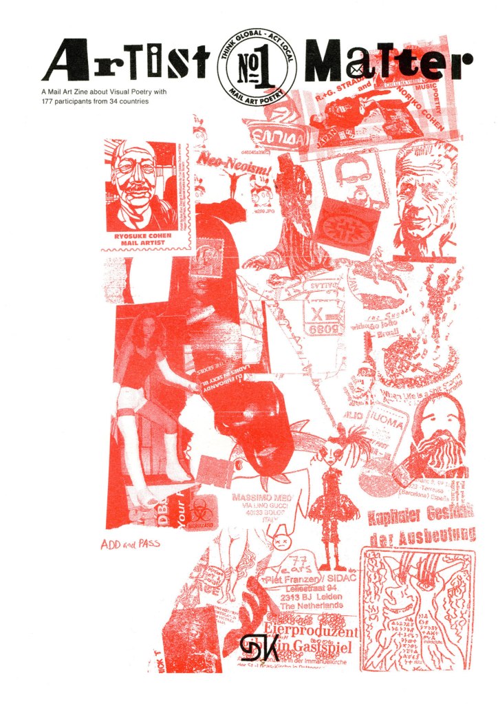 A recent outstanding project is Artist Matter Zine by Hans Braumüller, printed in Nachladen, Hamburg, 2019. Braumüller has been active in mail art and visual poetry for about thirty years. The Artist Matter Zine is based on its call “Artist Matter: Think Global – Act Local.” The diversity of the contributions can be viewed online on the artistmatter.crosses.net website.