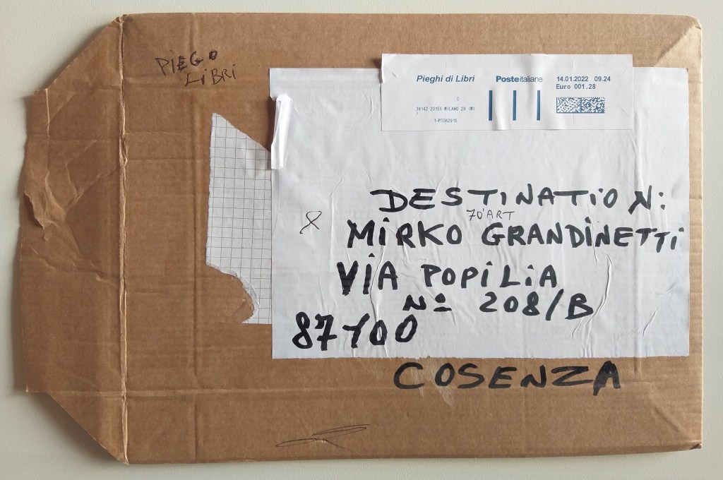 Oggi è arrivata l’opera di Roberto Scala per 70’ART. Roberto Scala era presente nell’ A.I.M.A. (Archivio Internazionale Mail Art) e nel M.I.M.A. (Museo Internazionale Mail Art).