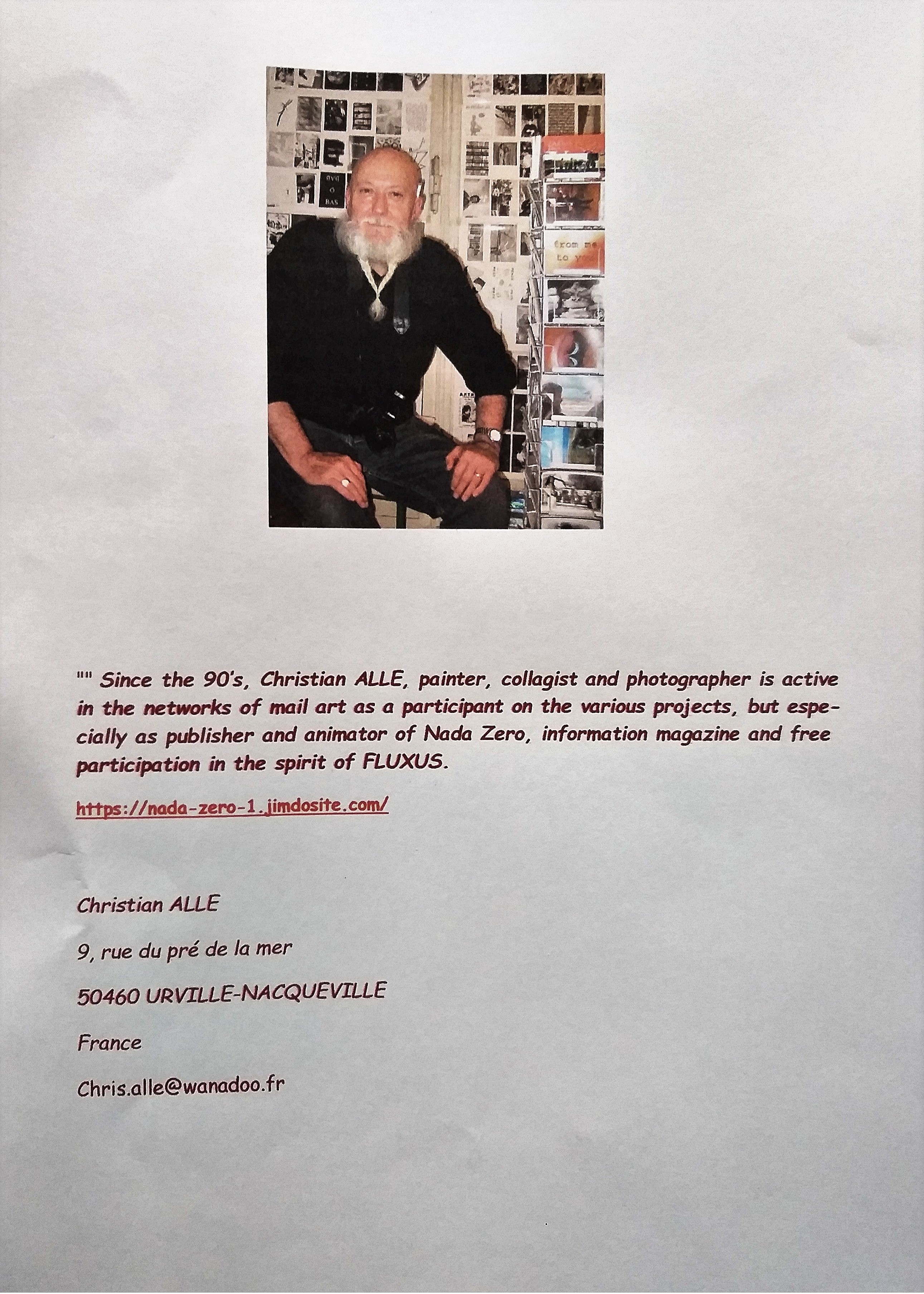 Christian Alle è nato nel 1948 a Marvejols en Lozère, Francia; vive e lavora in Normandia. Nel 1993 inizia a lavorare nella rete; questa data segna una svolta importante nella sua opera che diviene una riflessione sulla comunicazione e quindi una base importante per l’ arte postale. Dal 1999 ad oggi lavora come ceramista autodidatta per hobby.