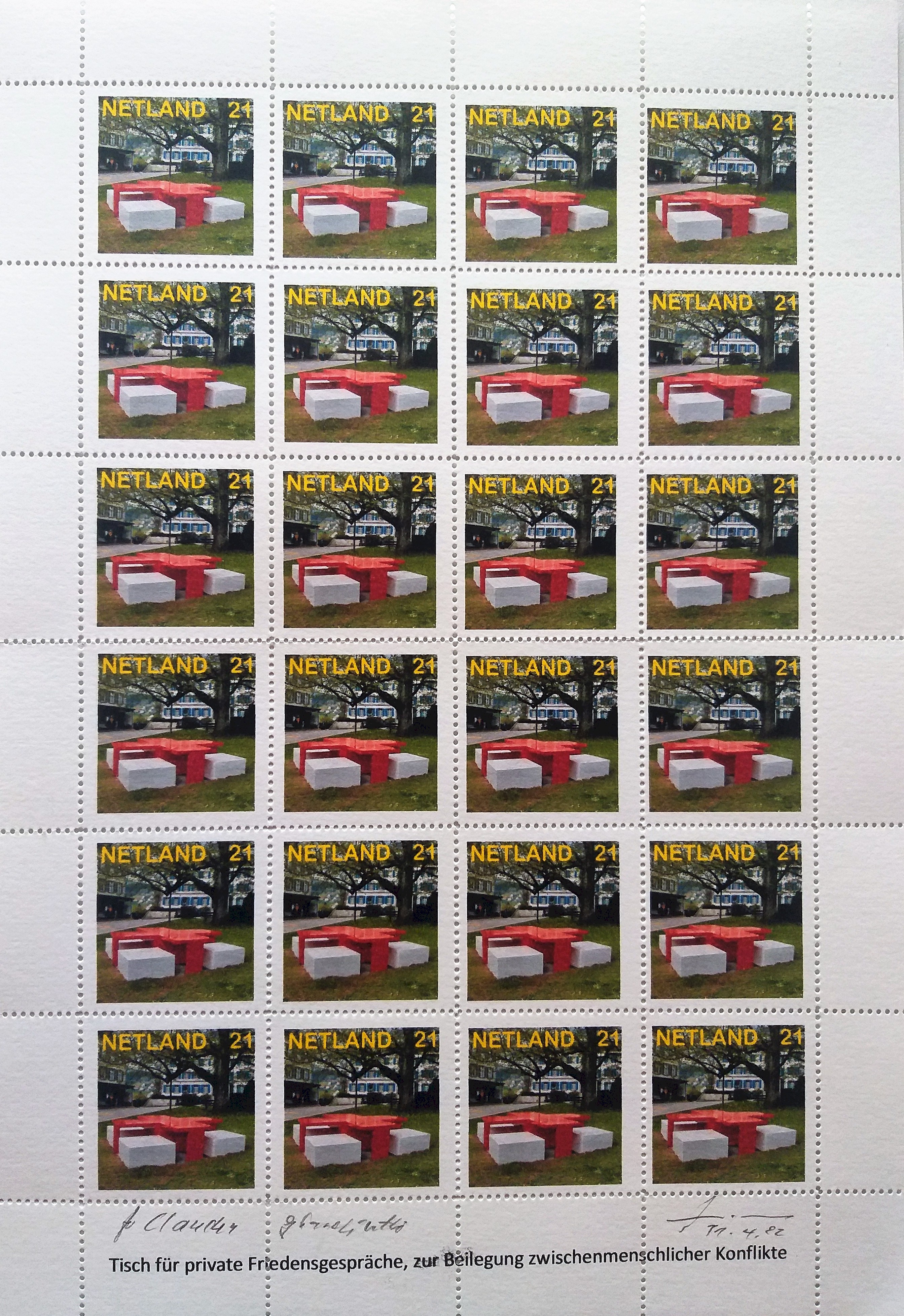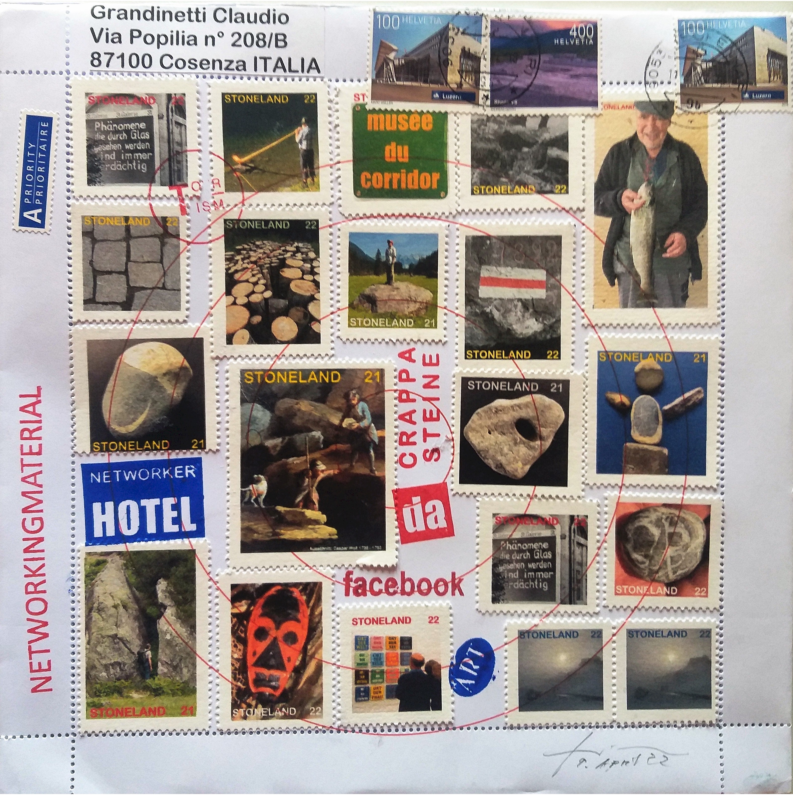 Suisse artist H.R. Fricker was born in Zurich in 1947. Today he lives in Trogen, Suisse, together with his wife. He has been active in the Mail Art network since 1981, up to 1985 he organized three shows. He initiated the first and second Decentralized Mail Art- and Networker Congress 1986 and 1992. In 1994 he started the Fax project “The Face of the Network” for the exhibition “Mail Art. Netzwerk der Künstler” (M.A. The artists’ network) at PTT museum in Bern, Suisse. Todays Museum of Communication in Bern, owns the major part of his archive, that can be seen in a permanent exhibition. Especially his Tourism calls made him popular, the programmatic stamps, political stamp sheets and of course his arranged squarish envelopes. In 2011 the Kunstmuseum Thurgau honored with a comprehensive retrospective H. R. Fricker, who conquered and occupied with his art various places, such as public spaces, envelopes, living rooms, and the Internet. In 2008, Fricker became a member of Facebook, since then he uses the social platform on a daily basis for posts in the context of art. He documents his activities on Facebook each year by printouts of “my social book“. Among his approximately 1400 Facebook friends and 200 subscribers are about 100 artists, whose posts he follows as well. Based on his call for “tourism” in the mail art network in 1985 he has met many of his Facebook friends in person.