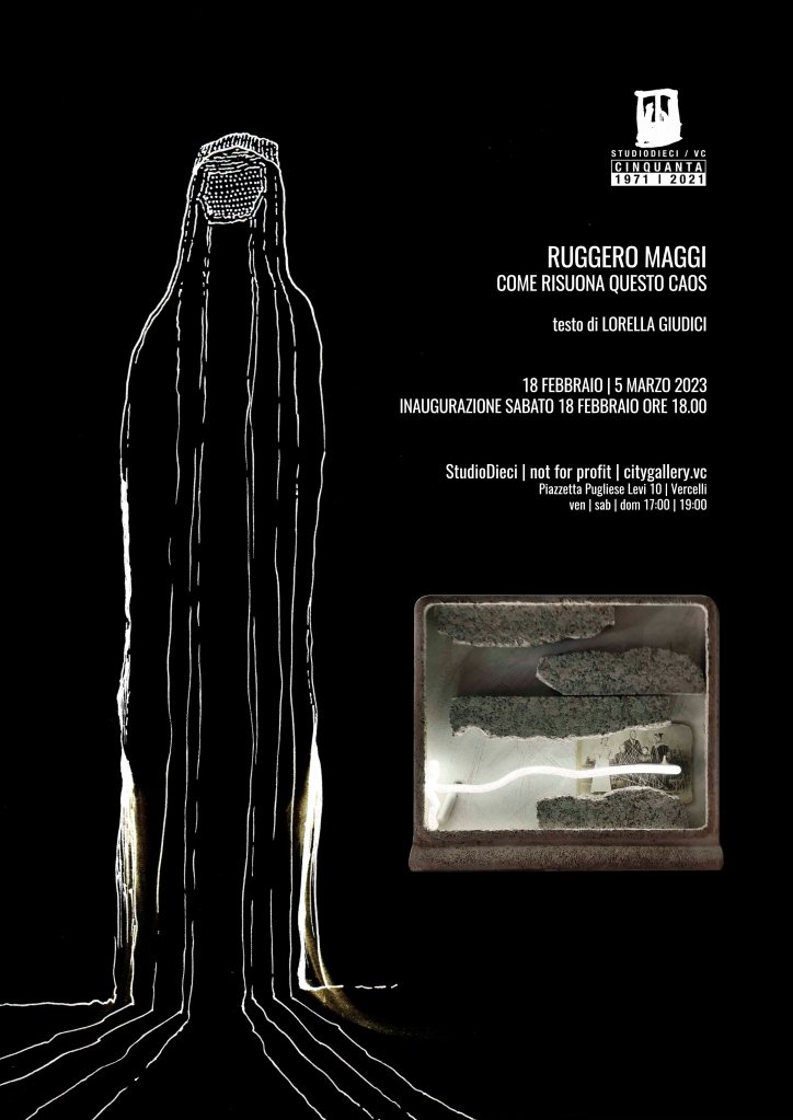 Studio Dieci, presieduto da Carla Crosio con la direzione artistica di Diego Pasqualin, propone nel contesto dei festeggiamenti del cinquantennale di fondazione una nuova esposizione nella sede di piazzetta Pugliese Levi 10 a Vercelli, ospitando l’artista Ruggero Maggi che proporrà la mostra “Come risuona questo Caos” presentata dal testo dello storico dell’arte Lorella Giudici.