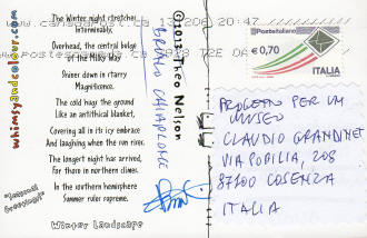 Bruno Chiarlone nasce a Rocchetta Cairo (Savona) il 7 febbraio 1947. Dalla fine degli anni ’70 svolge ricerca nel campo della scrittura visiva, pratica l’arte postale a raggio internazionale, realizza installazioni ambientali e azioni poetiche sul territorio, promuove progetti artistici e gruppi di ricerca come OSMOSI 70 a Cairo M.tte con Risc Dalla Corte, WORKAREA a Milano con Emilio Morandi, la Fondazione Arte Invisibile con vari artisti internazionali, tuttora in espansione. Degna di nota è la sua installazione-performance presso il Palazzo della Ragione di Alzano Lombardo (BG) del 1980, mentre la XVI Biennale di San Paolo del Brasile nel 1981 lo vede tra i partecipanti; l’anno successivo realizza un progetto nell’ambito di DOCUMENTA URBANA di Kassel, Germania. Nell’estate 1989 organizza una MAIL ART CONVENTION a Rocchetta Cairo a cui aderiscono, tra gli altri, Giorgio Nelva (Sperim.ar. di Torino) e Ruggero Maggi (Milan Art Center di Milano). Stende il Manifesto per la poetica dell’Eco-Arte che presenta nel marzo 1990 al Filmstudio di Savona; nello stesso anno partecipa alla realizzazione di alcuni grandi mura/es sulle case di Rocéhetta Cairo e inizia il progetto BRUNO CHIARLONE OPERA PALLET, con-installazioni di strutture in legno sul territorio della Val Bormida, presentate dai critici d’arte Angelo Dragone di Torino e Germano Beringheli di Genova. Nel 1991 lancia l’idea dell’ ECOMUSEO o museo del territorio, secondo la dichiarazione di Grenoble del 1971, da realizzarsi nel caratteristico paesino ribattezzato ROCCHETTA DEI MURALES (Ciao Italia, RAI UNO, 16.11.91, ore 10,45). Nell’aprile ’92 propone il suo progetto ECO-ART/CHIARLONE OPERA PALLET nel Forum Kunst und Schule di Guthersloh, Germania, con la collaborazione di Johannes W. Glawe, in collaborazione con la rete artistica mondiale, organizza a Rocchetta dei Murales una sessione del NETWORKER CONGRESS dal tema: Ecoarte per una nuova geografia dell’arte. Nell’aprile ’93 apre a Cairo M., con il fratello LoRenzo e alcuni giovani del luogo, la Saletta Arte e Cultura, spazio per mostre, presentazioni di libri, serate di studio. Nella primavera ’94 presenta in tale spazio la mostra ART RECOGNITION, una panoramica sul lavoro di un selezionato gruppo di artisti italiani impegnati nella ricerca, come Fulgor C. Silvi, Marcello Diotallevi, Nicola Frangione, Oronzo Liuzzi, Vittore Baroni, Emilio Morandi. Dall’estate ’94 conduce, a Cairo M.tte, il LABORATORIO CREATlVITA’ COMUNICAZIONE, presso la Saletta Arte e Cultura. Nella primavera 95 fonda con il fratello LoRenzo la rivista LIGURIA VAL-BORMIDA & DINTORNI, mensile di cultura, attualità e promozione di attività locali che incontra crescente interesse e rappresenta un valido esempio continuativo di stampa periodica precisa e aperta alle novità culturali nonchè rassegna positiva della realtà in Val Bormida. Successivamente ha promosso, dapprima il LABORATORIO DI POESIA E SCRITTURA INTERATTIVA con incontri quindicinali a Cairo Montenotte tra poeti e artisti locali, successivamente ha inventato il CENACOLO DI LETTURA (dal 28/9/2001) con incontri mensili sulla lettura creativa, presentato da Barbara Salvo.