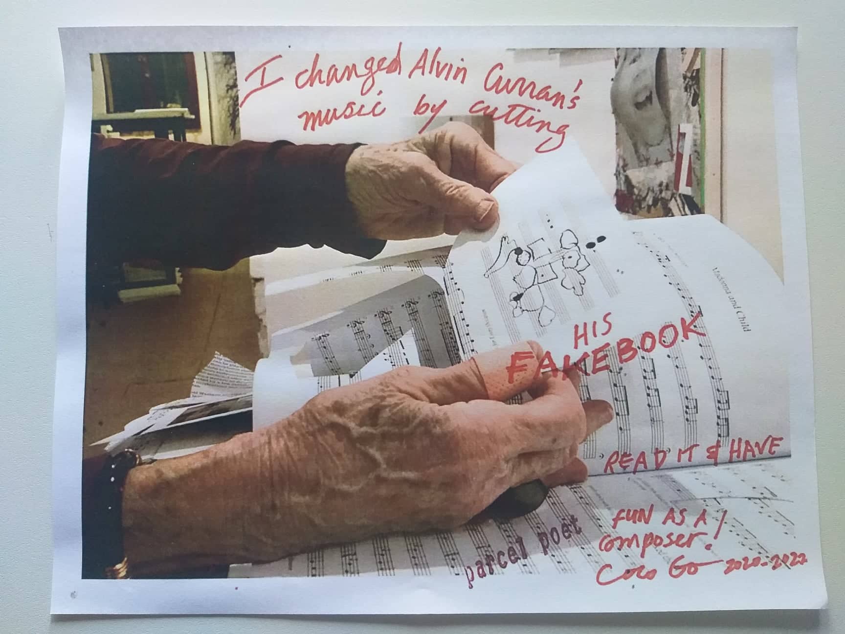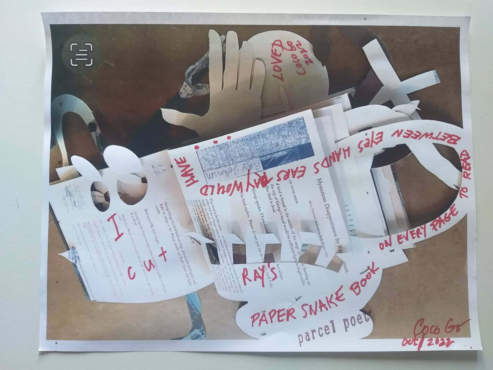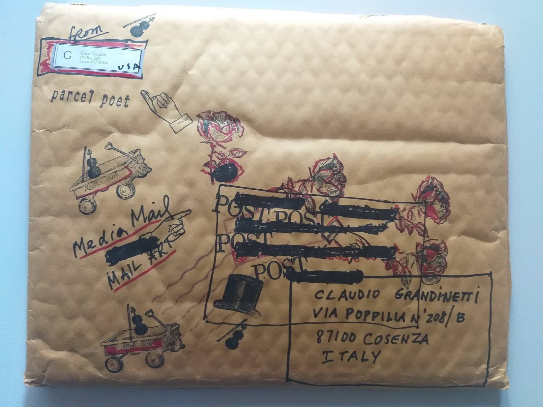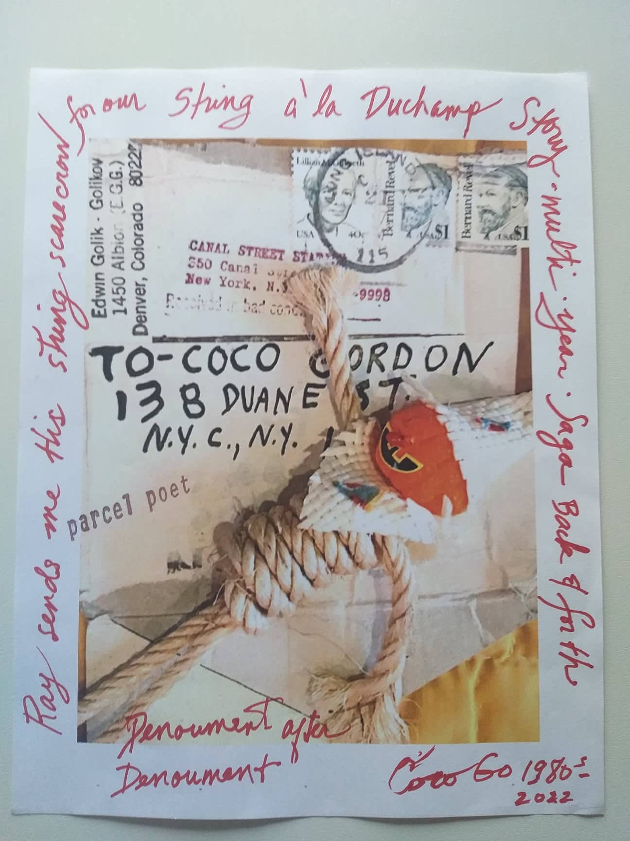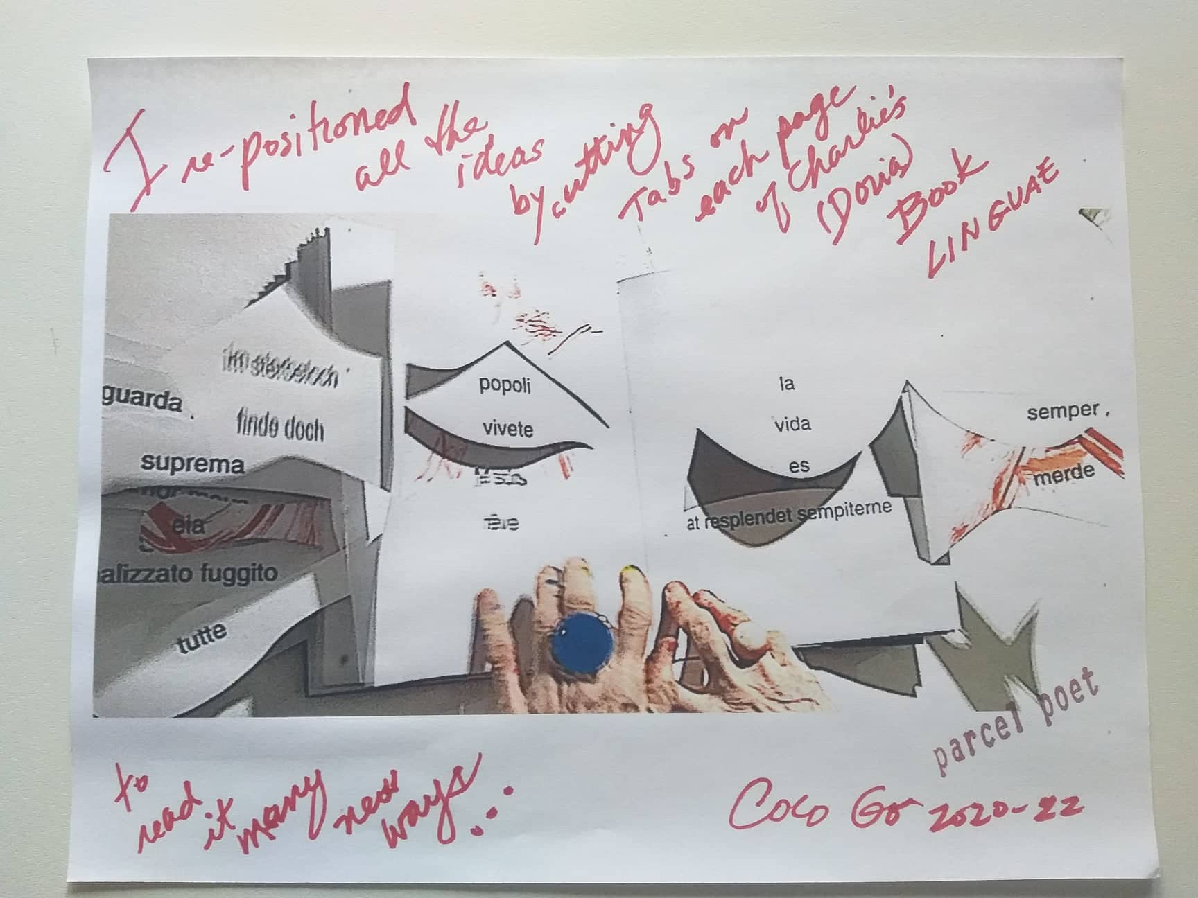 Coco Gordon (Genova, 1938) vive e lavora a Lyons, nel Colorado. Anche conosciuta come SuperSkyWoman è artista, poeta, performer, editrice. Dopo avere affiancato gli esponenti del gruppo Fluxus negli anni della sua maggiore attività, da tempo impegnata a capo di un gruppo di aggregazione sulle tematiche del territorio, della natura, del biologico, dei sistemi di vita (Permacultura). Conta la pubblicazione di 46 libri tra cui Radical Food, Hip Hop Solarplexus, SuperSkyWoman, TIKYSK, e Life Systems, un montaggio di 41 artisti che lavorano per creare un pianeta sano. Coco Gordon dal 1982 è attiva e parte integrante del movimento Fluxus. L’artista, dedita soprattutto alla produzione di libri d’artista con opere esposte a Vienna da Kunst Kanzlei e alla EMILY Harvey a NY e Venezia. È molto attiva ed ha partecipato a diverse Biennali Internazionali d’arte di Venezia. In tanti anni di lavoro ha realizzato numerose performance, come per esempio, quella tenuta nel 1983 a Reggio Emilia presso il ridotto del Teatro Municipale, l’installazione newyorkese con chitarra datata 1984. Nel giugno del 1984 Coco Gordon partecipa all’evento Il fascino della carta organizzato da Pari & Dispari. Nel 1993 con altri artisti presenta a Casa Malaparte a Capri un’installazione diurna a e una notturna chiamate LU’AQUA. Nel 1999 è invitata a fare una performance alla 48. Esposizione Internazionale d’Arte della Biennale di Venezia. Nel 2003 Coco Gordon partecipa alla collettiva con 130 artisti, ideata da Pari&Dispari Un cuscino per sognare. Nel 2020 viene invitata a fare una performance dal titolo “EXPLODING RED PIANO KEYBOARD installazione in progress” presso lo Spazio Visioni Altre a Venezia. Da alcuni anni realizza libri tagliati. I Libri Tagliati/Condivisi, sono l’ultima produzione artistica di Coco Gordon. L’artista ritaglia, appunta, disegna, dando una nuova forma e una diversa interpretazione al libro. Nel 2020 un grande evento, viene presentato dalla Collezione Bongiani Art Museum presso lo Spazio Ophen Virtual Art Gallery di Salerno una retrospettiva esaustiva e completa con 72 opere, dal 1958 al 2020, che definiscono l’intero percorso artistico svolto da questa originale e importante artista americana. Dal 18/11/2022 fa parte dell’ A.I.M.A. Archivio Internazionale Mail Art, del M.I.M.A. Museo Internazionale Mail Art e del web Artefice Contenitore d’Arte Moderna e Contemporanea. www.artefice.art