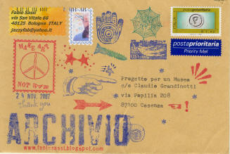 1990: “Scratches On The Walls”. A photographic journey, discovering the many different graffiti styles of Europe. 1993:“Cyclopean Power”. Graphic works presenting bicycles as the best way to move in the city. 1995: “Happy Birthday Cinema!”. A celebration of the cinema in a combination of acrylic and graphic collage. 1997:“Homage To Andy Warhol”. An intense use of graphics, stencils, copy art and collages to celebrate one of the most intriguing minds of Modern Arts, on the 10th anniversary of his death. In 1997 I was invited to join the exhibition “Symbols Of The 21st Century” held by the Museum of Post and Communication in Berlin. I completed my largest Mail Art piece (13x7ft) for it. On a smaller scale, some of my Mail Art artworks have become printed postcards: 1995: Rodolfo Valentino Centennial commissioned by the Municipality of Castellaneta, the birthplace of Valentino. 1997: Homage To Andy Warhol, commissioned by the Andy Warhol Museum in Medzilborciach (Slovakia). Some of my works appeared also on Printmaking Today (U.K.), winter 2000 and spring 2001 issues, on Somerset Studio (USA) sep/oct 2003, Paris Capitale (France) oct/nov 2003. Since 2002 I join Remember September a Mail Art project which is developed by Gail Ellspermann, Katona, NY to commemorate, on an annual basis, the tragic attacks on the United States on September 11, 2001. On 2006 I’ve joined some important projects as: