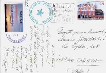 François Frisch, called Fraenz ,is an autodidact in fine arts. He was born in Luxembourg, on August 12, 1943. He attended courses in drawing , painting watercolour, engraving and since 1975, devoted himself to photography as well. He took part in many collective exhibitions.From 1984 to 2006 he was a member of the consulting culture committee of his administrative district. In 2001, he is the co-founder of an annual Festival de la Gravure in Luxembourg. In the 2002, encouraged by the artist francis Van Maele (Francis Fan Mail), now living in Ireland, he dedicated himself to mail art. The encounter and the friendly relation with Baudhuin Simon from Belgium (Pigdada), has been decisive for his future activities. Fraenz established many international relationships, always partecipated with original work in a lot of projects, designs (and collects) personal postcards and artistamps in limited editions.The most important personal project: the list of artists on his site:http://www.mailart.lu/adressen.htm