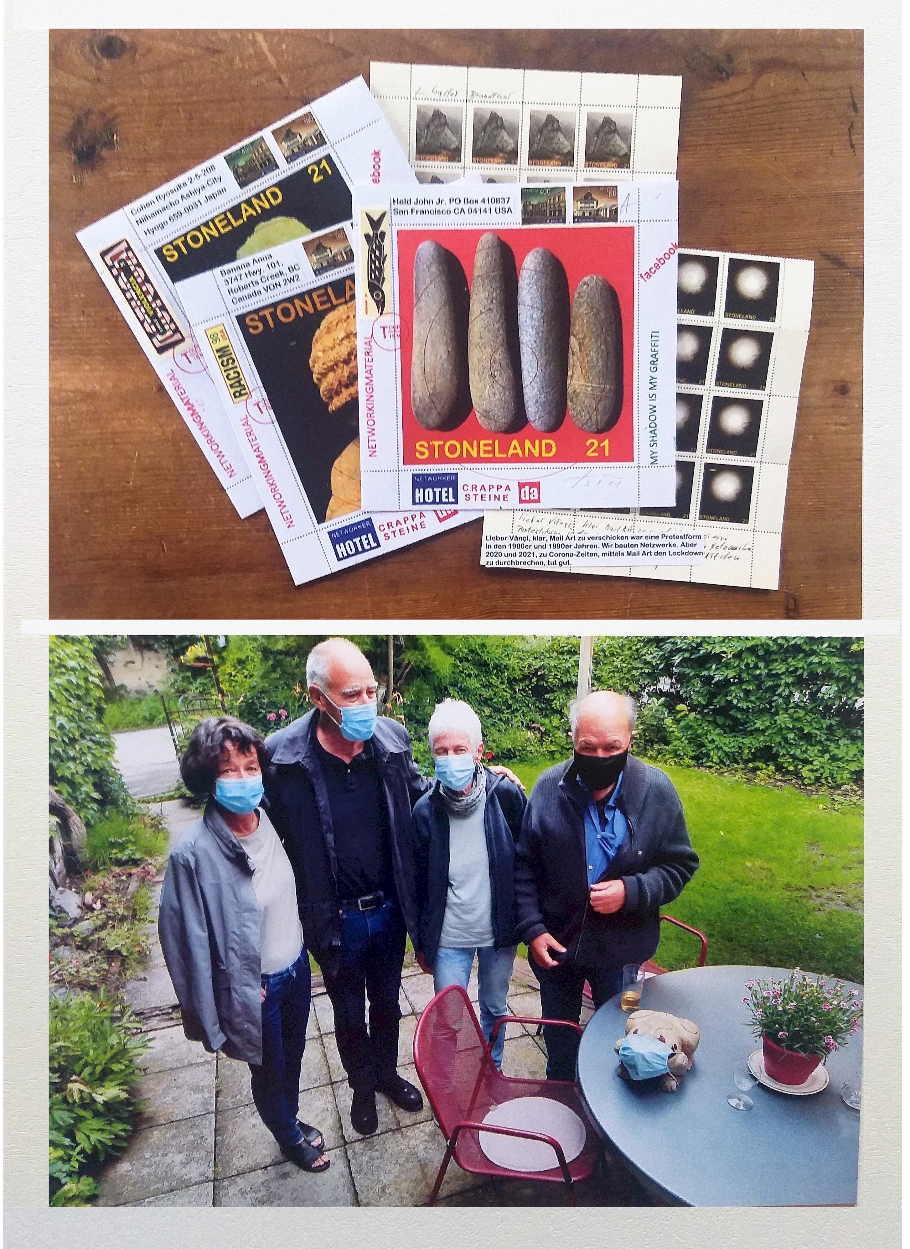 Suisse artist H.R. Fricker was born in Zurich in 1947. Today he lives in Trogen, Suisse, together with his wife. He has been active in the Mail Art network since 1981, up to 1985 he organized three shows. He initiated the first and second Decentralized Mail Art- and Networker Congress 1986 and 1992. In 1994 he started the Fax project “The Face of the Network” for the exhibition “Mail Art. Netzwerk der Künstler” (M.A. The artists’ network) at PTT museum in Bern, Suisse. Todays Museum of Communication in Bern, owns the major part of his archive, that can be seen in a permanent exhibition. Especially his Tourism calls made him popular, the programmatic stamps, political stamp sheets and of course his arranged squarish envelopes. In 2011 the Kunstmuseum Thurgau honored with a comprehensive retrospective H. R. Fricker, who conquered and occupied with his art various places, such as public spaces, envelopes, living rooms, and the Internet. In 2008, Fricker became a member of Facebook, since then he uses the social platform on a daily basis for posts in the context of art. He documents his activities on Facebook each year by printouts of “my social book“. Among his approximately 1400 Facebook friends and 200 subscribers are about 100 artists, whose posts he follows as well. Based on his call for “tourism” in the mail art network in 1985 he has met many of his Facebook friends in person.