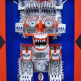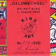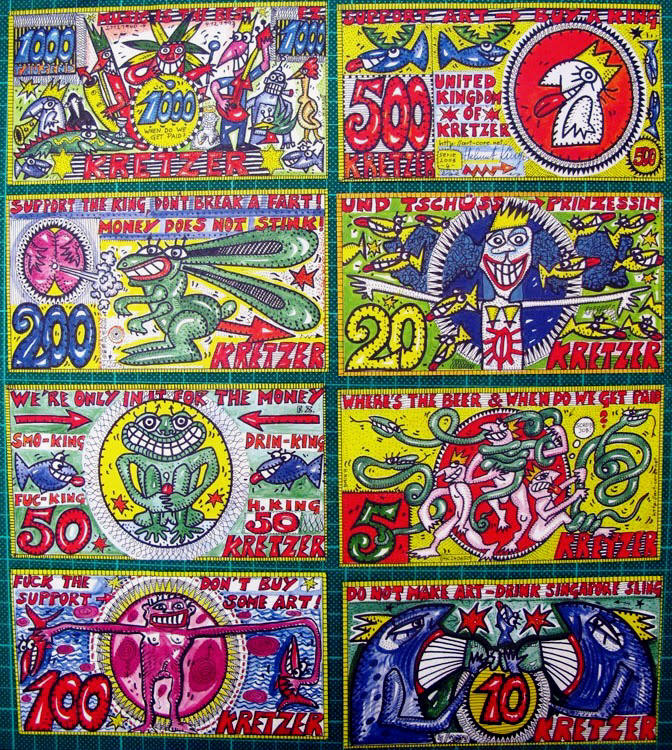 “Le più varie espressioni a cavallo tra pittura, fumetto e produzioni multimedia, spesso segnate da una riottosa sensibilità neo-pop e interfacciate con l’immaginario del rock e delle nuove sonorità elettroniche, vengono date oramai per acquisite al ventaglio delle nuove tendenze artistiche negli Stati Uniti – dove hanno conquistato vetrine in prestigiosi musei e dove consentono il proliferare di un florido circuito di gallerie alternative e riviste specializzate – ma sono guardate ancora dalla critica con sospetto e disattenzione in ambito europeo, il vecchio continente pare infatti ancora restio a metabolizzare un’espansione del sistema dell’arte, corrispondente anche ad un ricatto generazionale nei ranghi dei collezionisti, che vada ad includere ibridazioni con sub-culture pop(olari) “politicamente scorrette” e produzioni industriali o massmediali a costi contenuti. Eppure non mancano, anche in Europa, personaggi che figurerebbero con onore sulle pagine di Juxtapoz e Rav Vision. Prendiamo il caso, uno tra tanti ma ugualmente esemplare, Helmut King, autore dal segno deciso e accattivante nato nel 1950 e attivo professionalmente dalla fine del decennio successivo tra Austria e germani (con studio a Bregenz e Lindau), un artista che ha assorbito la lezione delle avanguardie storiche e i modi dell’espressionismo astratto, contaminandoli con miti e strategie del Pop e del graffitismo, fino a pervenire ad uno stilizzato (pseudo)primitivismo figurativo dal vivace impatto coloristico. Simboli ricorrenti nel vocabolario di King sono difatti personaggi irrispettosi (quali un pesce e un piccolo re che fanno la linguaccia) che rimandano alla patafisica Dada di Papà Ubu come agli omini elastici di Keith Haring. Ludici antieroi cartooneschi che oltre a popolare tele, cornici, mobili e pareti escono dagli spazi deputati per far mostra di sé sulle vele di barche che solcano alpini laghi alpini o da installazioni in spazi pubblici come il grande murale assemblato in una piazza austriaca con migliaia di piccoli badge usati a mò di tessere di mosaico, ciascun bottone recante un diverso disegnetto originale Come Un Mastro Geppetto psichedelico King grande fan della musica di Frank Zappa, porta poi alla vita nel suo affastellato studio, oltre a piccole sculture in legno semovibili su rotelle come bizzarri giocattoli, una serie infinita di omuncoli, mostri, sciamani, alieni, gnomi, indiani e cow-boy realizzati tramite l’ingegnoso recupero di pacchetti vuoti di sigarette, ritagliati e dipinti a violenti contrasti di colori primari e di tappi da birra o champagne, carta stagnola e altri piccoli oggetti di scarto, usati per creare occhi, tette, capelli, corazze e agghindare fantiosamente le antropomorfiche creazioni. Impossibile non rammentare anche il meticoloso bricolage del riciclo di autori Fluxus come Al Hansen, a cui lirici nudi femminili assemblati con mozziconi di sigaretta raccolti per strada King risponde coi suoi fragili e ieratici Cigarette Box People (il catalogo omonimo è del ‘96 per le edizioni Christian Schneeberger di St. Gallen), totemici personaggi a tre dimensioni contenuti in scatole-cornici multicolori, appartenenti a fantasiose mitologie urbane ed evocative divinità falliche e altri motivi dell’arte primitiva, uniti agli atteggiamenti sessualmente disinibiti dei comix underground. Se la California ha i suoi Hell’s Angels motorizzati e una vivace sottocultura di scapestrati tatuatori e illustratori di custom car, non da meno sagaciamente edonistica è del resto la tradizione teutonica dagli Oktoberfest, che King amalgama nei suoi meta – fumetti mettendo enormi boccali di birra in mano ai cow¬-boy e affiancandoli alle placide vacche al pascolo dei penditi alpini. Che LA e la Baviera non siano poi tanto distanti il baffuto artista lo dimostra anche in una serie di movimentate serigrafie ispirate a brani celebri delle Mothers of Invention, raccolte nel 2000 nel cofanetto I’m the indian of the Group (che che comprende anche un CD, un pin metallico, uno stencil e un paio di bacchette da batterista) realizzato con l’imprimatur e la fattiva collaborazione di Jimmy Carl Black, storico membro della formazione americana “L’indiano del gruppo”, come amava introdurlo in concerto Zappa, da qualche tempo si è difatti trasferito in Germania e qui opera con la sua nuova band The Grandmothers, per cui King ha realizzato alcune copertine. “Arte è quando crei qualcosa dal nulla…e poi la vendi”, tenendo fede alla pragmatica affermazione del suo idolo Zappa, King ha spesso giocato e ironizzato sul concerto di marketing dell’opera d’arte, non solo producendo linee di magliette, badge, cartoline, francobolli, ma anche promovendosi col contraddittorio motto “Sostieni l’arte, non comprare un King”: non acquistando un suo quadro – argomenta l’artista nell’introduzione ad una mostra – puoi risparmiare fino a diecimila euro, ma tornado a casa dalla galleria potresti perdere il portafoglio, lo trova un artista squattrinato che ha conflitti di coscienza ma poi spende tutto al gioco e in alcolici, fa un incidente d’auto e muore…per risolvere lo spinoso problema economico, King ha portato a termine nel corso del 2000 il progetto Y2K-Daily Pix, ovvero per un anno ha creato ogni giorno, datandola con un timbro, una diversa opera formato cartolina. Ha poi documentato il tutto su CD – Rom ed esposto l’intera collezione alle pareti del Café Kolibri di Bregen, dove gli avventori potevano scegliere e acquistare per modica cifra uno dei lavori. Ancora più paradossale, come commento alla mercificazione dell’arte, è poi la serie di banconote in diversi tagli da 5 fino a 1000 “Kretzer” di valore, ideate nel 2003 per il Regno Unito di Kretzer (dal nome di un gruppo di artisti di Bregenz di cui ha fatto parte), con cui King aderisce al progetto internazionale Fantastic United Nations (FUN) denaro d’artista multicolore che l’autore dispensa