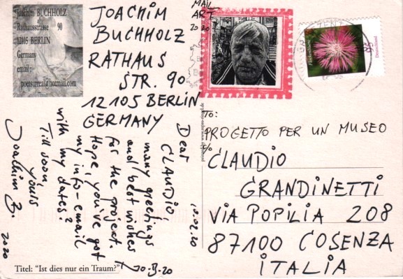 Joachim Buchholz Geboren in Berlin am 19.03.1955 Vertreter des poetischen Surrealismus Anschrift: 12105 Berlin Rathaus Str. 90 Email : poetsureal@hotmail.com Mail Art und Surrealismus Ausstellungen in Galerie 1 „ Surreale Poesie „ Tempelhofer Damm 199/200 , 12099 Berlin Von 2004 bis 2014 Galerie 2 „ Surreale Poesie „ Attliastr. 176 , 12105 Berlin Von 2015 bis 2018 Ausstellungen von Mail Art und Internationalen Mait Art Künstlern (Kazunori Murakami ,Ryosuke Cohen, andere ) Seit 1984 Mail Art Connection mit japanischen Künstlern Kazunori Murakami, Ryosuke Cohen, Shozo Shimamoto,Tiziana Baracchi, Edition Janus/Eberhard Janke,Dr.Klaus Groh,Henning Mittendorf,Theo Breuer,Michael Lumb, und andere Mail Art Künstlern ( Projekte ) Studium SGD, HFL ,ILS von 1978 bis 1981 in: Werbegrafik, Schriftgrafik, Malerei, Zeichnen ,Grafik und Freie Kunstschule Berlin, VHS Berlin , Künstlerbund Seit 1979 Einzel- und Gruppenausstellung in Berlin ,BRD,Japan ,andere Seit 1984 Teilnahme an Internationalen Mail Art Projekten Seit 1979 Mitgliedschaft im Berliner Künstlerbund,Selbsthilfe Berliner Künstler,Arbeitskreis bildender Künstler und andere. Unter folgenden Anschriften aktiv : 12105 Berlin ,Cantorsteig 7,