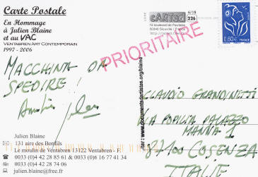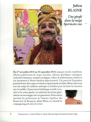 Julien Blaine (Rognac, Francia, 1942)poeta, artista visuale e sonoro, performer, editore, direttore di riviste, vive a Ventabren e a Marsiglia. Nella sua vita artistica ha assunto numerose identità. Il suo vero nome è Christian Poitevin.Ha fondato diverse riviste, tra le quali “Approches”, “Robho”, “Geronymo” e “Doc(k)s”. Ha diretto collane editoriali, tra le quali “Zérosscopiz” (1979/89) e “V.A.C.” (ventuno titoli pubblicati a partire dal 1997).Ha realizzato numerose pièces sonore, alcune delle quali sono documentate in cassette, dischi e CD. È presente in diverse audio-antologie pubblicate sotto le sigle di “Baobab” (1979), “Audio Art” (1978), “Breathing Space“ (1979), “Vec” (1979 e 1982), “Inter” (Neoson, 1985), ”Il Verri” (Verbivocovisual, 2005), ecc. È rappresentato, tra l’altro, nello storico LP Text und Aktionsabend (Ed. Anastasia Bitzos, 1968) e in Polyphonix (Ed Multhipla Records, 1981).Ha realizzato numerossissime edizioni in tiratura limitata e libri d’artista. Tra le mostre personali ricordiamo almeno quelle alla “Galerie Lara Vincy” (Parigi, 1979, 1992, 2002), alla galleria “Franklin Furnace” (New York, 1980), al Centre Pompidou (Parigi, 1982), allo “Studio Morra” (Napoli, 1986), al “Mercato del Sale” (Milano, 1987), fino alle più recenti presso la “Galerie Meyer” (Marsiglia, 2004), “Studiobrescia” (Brescia, 2004), “Espace à vendre” (Nice, 2004).Tra le rassegne collettive sono da ricordare almeno la “Biennale de Paris” (1967) e la serie di mostre “Logomotives” (1983/1992).Ha partecipato come autore e attore a film e videofilm, tra i quali “Collage” (Sarenco, 1984), “En attendant la troisème guerre mondial” (Sarenco, 1985/1986), “De la poèsie visuelle à l’art total” (Claudio Francia, 1999). Ha registrato video-performance per “Télé-Libération”, “Atelier Sud Vidéo”, Centre Pompidou, ecc.È un organizzatore culturale molto attivo che segue con attenzione l’evoluzione delle ricerche poetiche internazionali.Dirige il V.A.C. (Ventabren Art Contemporain). È stato l’animatore dei festival di poesia sonora d’Avignon (1977, 1978, 1979), di Cogolin (1984, 1985, 1986), di Allauch (1987) e di Tarascon (dal 1988 al 1993). È co-organizzatore del festival di Lodève dal 1997.