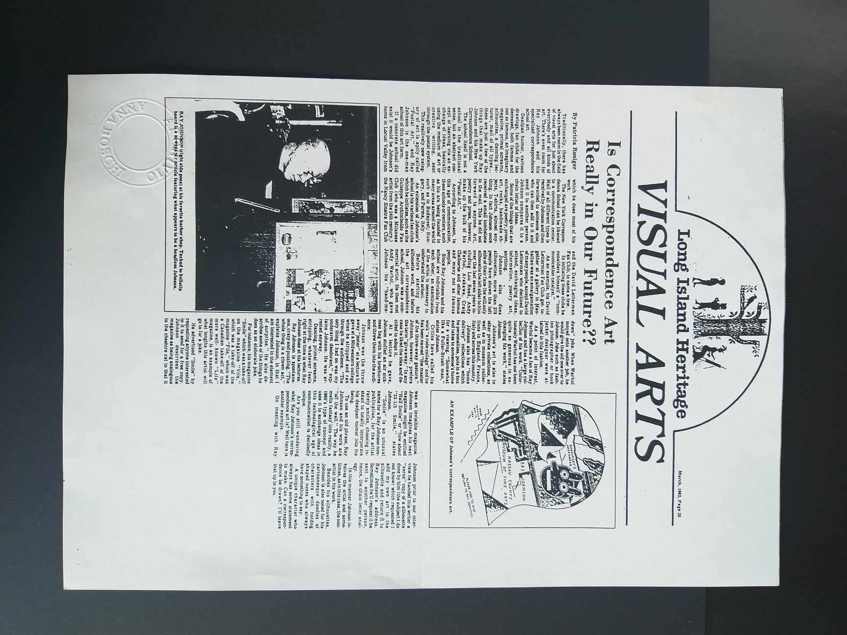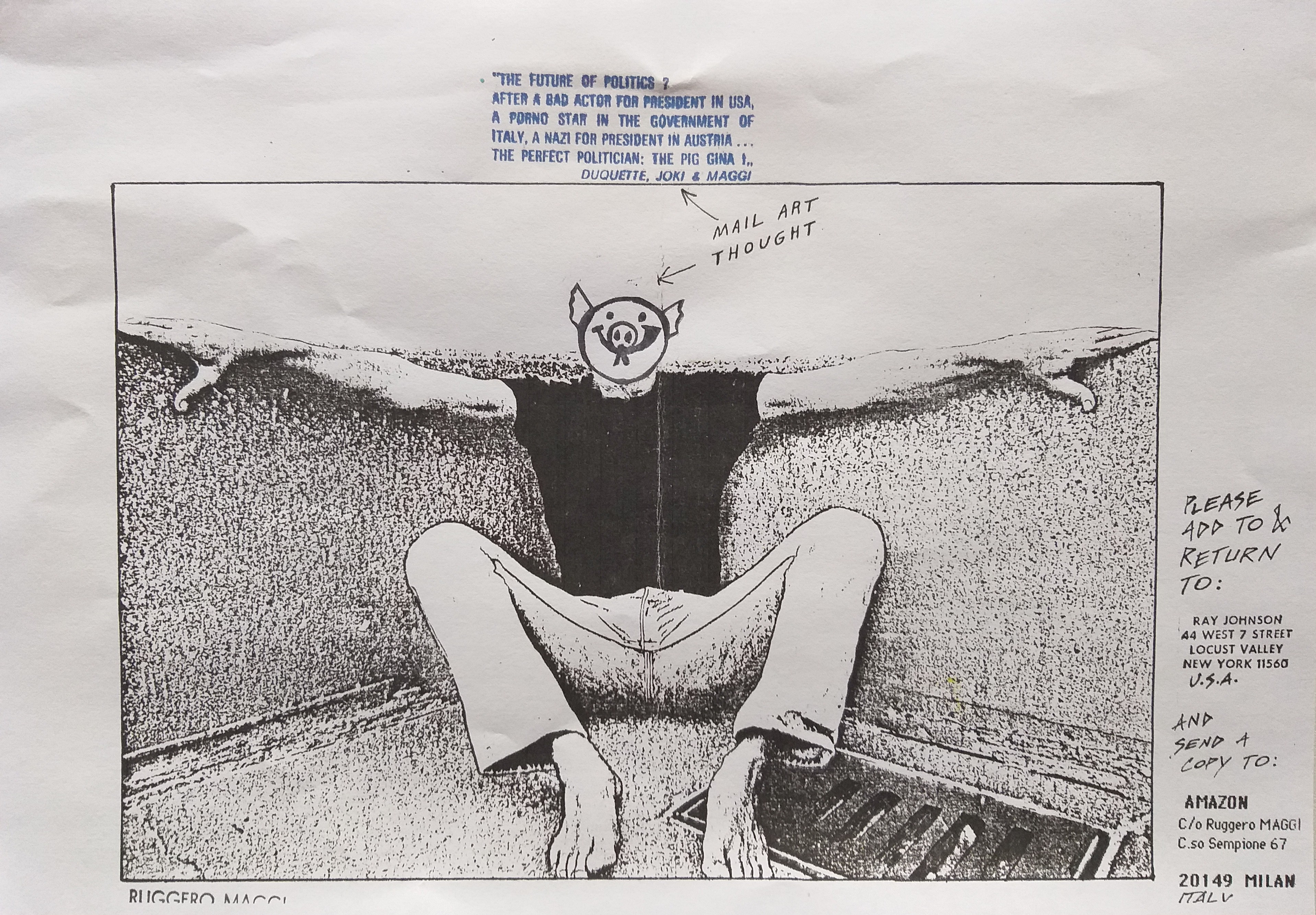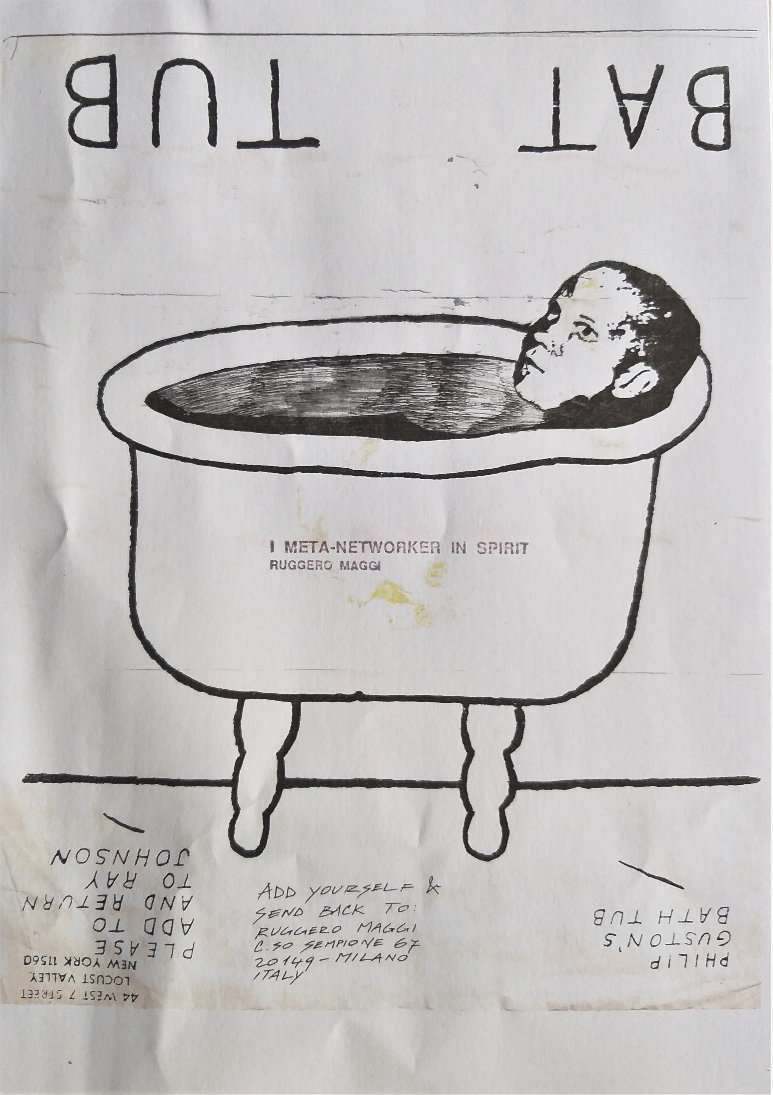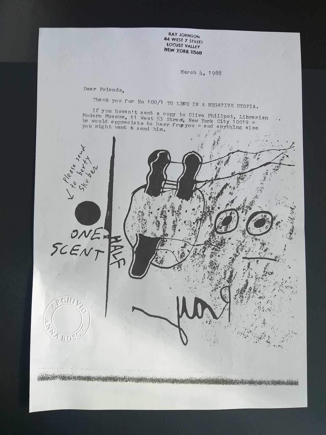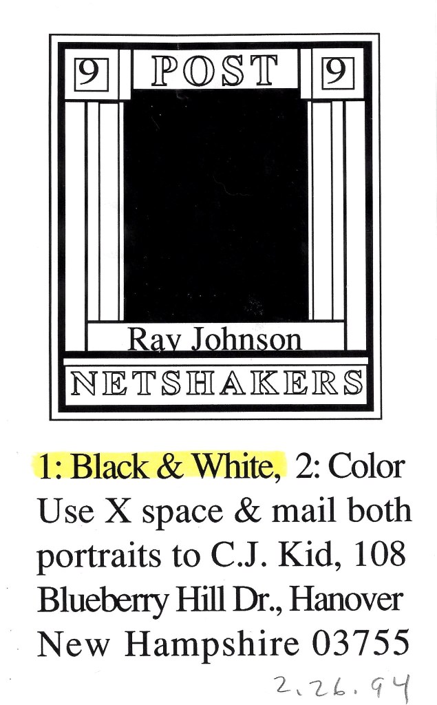“Lo scorso ottobre 2022, ho consegnato a mano “L’ultimo autoritratto di Ray Johnson” all’Università dell’Iowa’s Alternative Traditions nell’archivio delle arti contemporanee, Iowa City, IA. (Il ritratto può essere recuperato nella casella n. 34, portafoglio n. 1). Credo che la storia del ritratto abbia qualche merito, un pezzo importante di una complicata “prestazione di morte” piena di enigmi che Johnson ha piantato negli ultimi giorni, settimane e mesi della sua vita. Il francobollo mi è stato postato dopo che ho inviato un invito personale a Ray Johnson nel 1994. La risposta di Ray è uno dei soli sei timbri d’artista fatti durante la sua vita. Il ritratto di Johnson è stato disegnato con penna nera e inchiostro, oscurando completamente lo spazio dove doveva apparire il suo volto. Forse il “niente ritratto” di Johnson era una premonizione inquietante, un riflesso del suo stato psicologico pochi mesi prima che si togliesse la vita a Sag Harbor Bridge. Il ritratto è stato realizzato da Ray su un modello di francobollo di “Netshakers”, parte di un foglio di francobollo seghettato pubblicato da AVA Gallery in “Netshaker”, Vol 3, numero n.1. Il tanto ricercato foglio artistamp è stato reso possibile grazie a una sovvenzione del 1993 del New Hampshire Council For the Arts. L’edizione offset contava 1000 fogli e comprendeva gli autoritratti di altri 99 networker di mail art.”