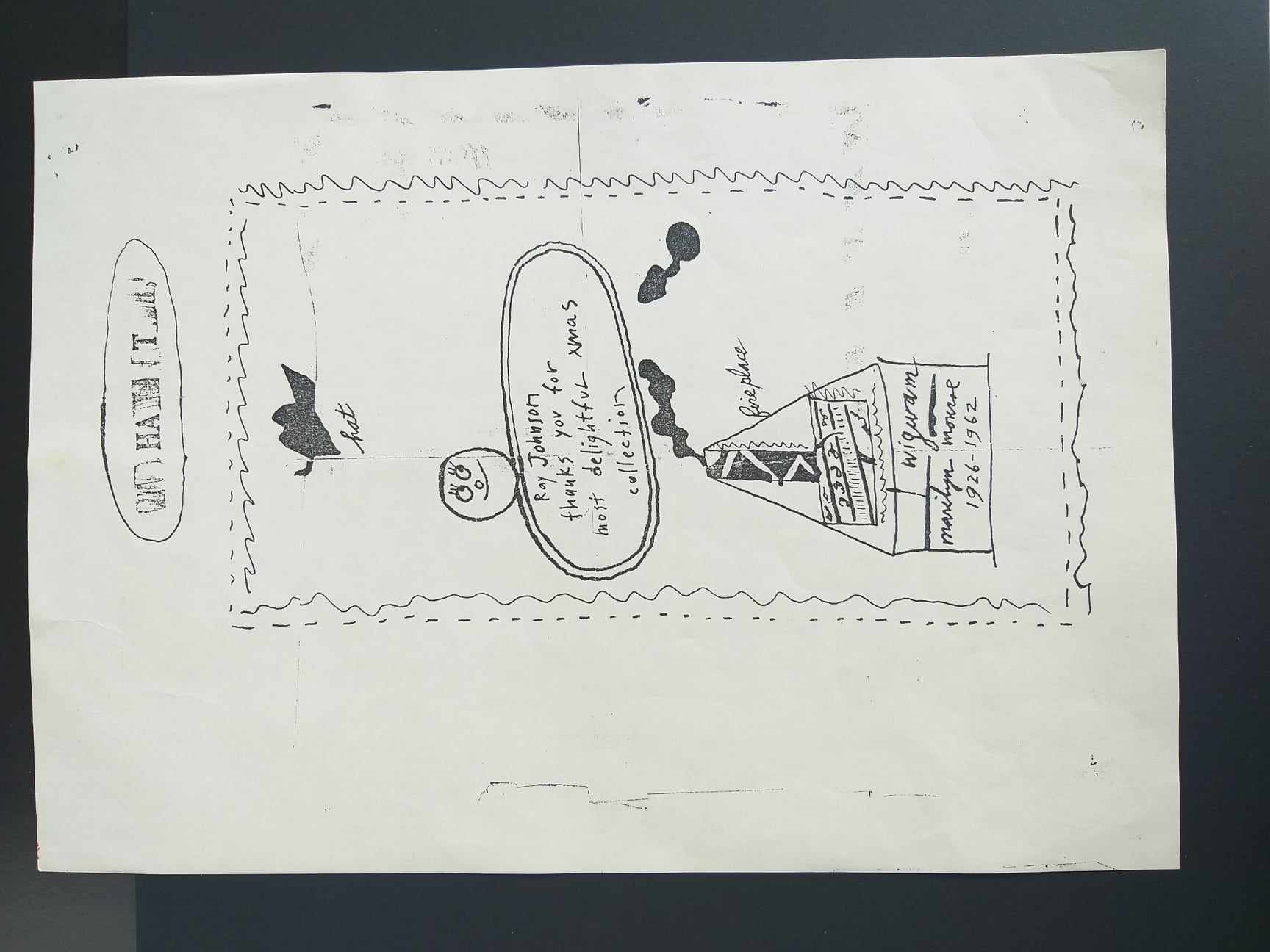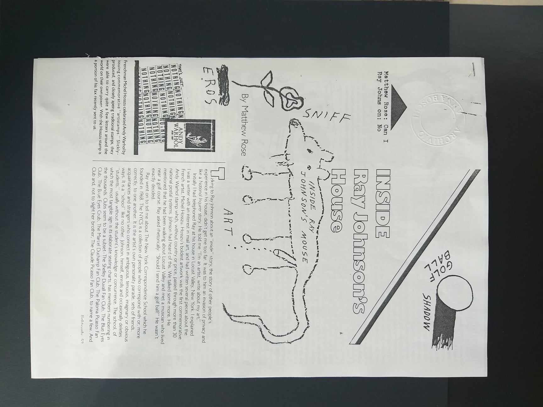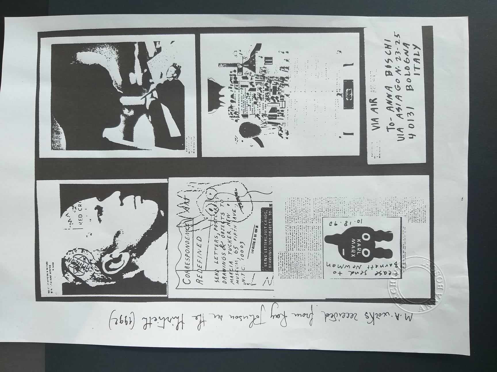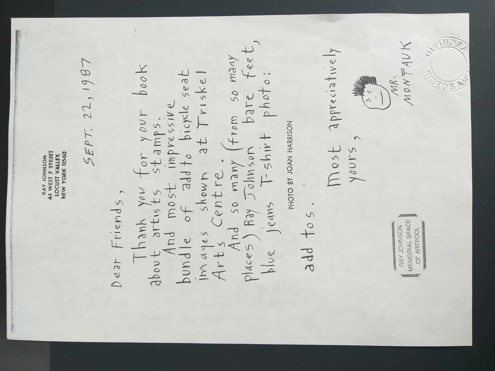 “Lo scorso ottobre 2022, ho consegnato a mano “L’ultimo autoritratto di Ray Johnson” all’Università dell’Iowa’s Alternative Traditions nell’archivio delle arti contemporanee, Iowa City, IA. (Il ritratto può essere recuperato nella casella n. 34, portafoglio n. 1). Credo che la storia del ritratto abbia qualche merito, un pezzo importante di una complicata “prestazione di morte” piena di enigmi che Johnson ha piantato negli ultimi giorni, settimane e mesi della sua vita. Il francobollo mi è stato postato dopo che ho inviato un invito personale a Ray Johnson nel 1994. La risposta di Ray è uno dei soli sei timbri d’artista fatti durante la sua vita. Il ritratto di Johnson è stato disegnato con penna nera e inchiostro, oscurando completamente lo spazio dove doveva apparire il suo volto. Forse il “niente ritratto” di Johnson era una premonizione inquietante, un riflesso del suo stato psicologico pochi mesi prima che si togliesse la vita a Sag Harbor Bridge. Il ritratto è stato realizzato da Ray su un modello di francobollo di “Netshakers”, parte di un foglio di francobollo seghettato pubblicato da AVA Gallery in “Netshaker”, Vol 3, numero n.1. Il tanto ricercato foglio artistamp è stato reso possibile grazie a una sovvenzione del 1993 del New Hampshire Council For the Arts. L’edizione offset contava 1000 fogli e comprendeva gli autoritratti di altri 99 networker di mail art.”