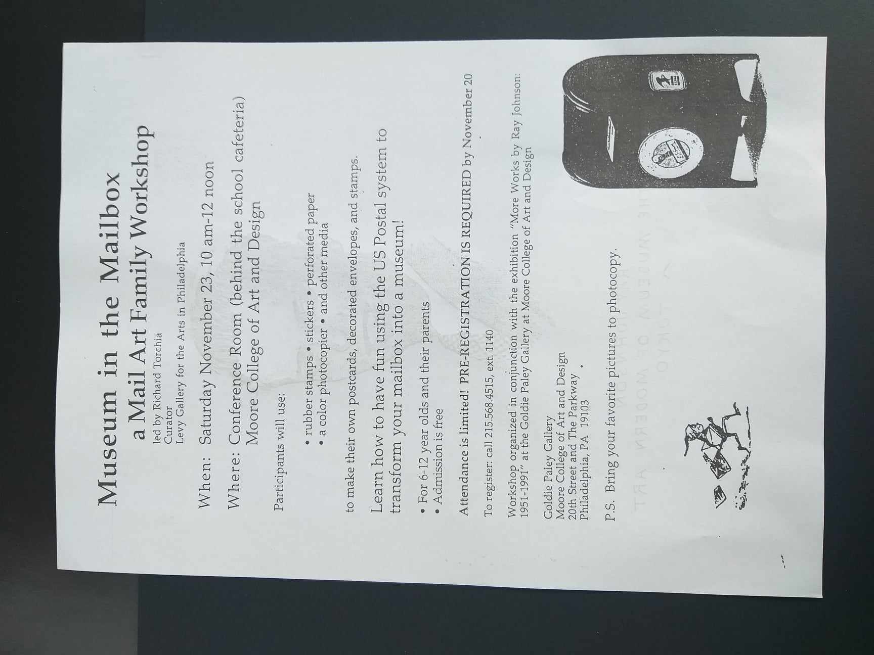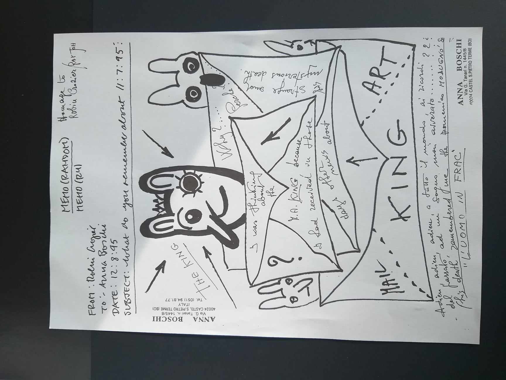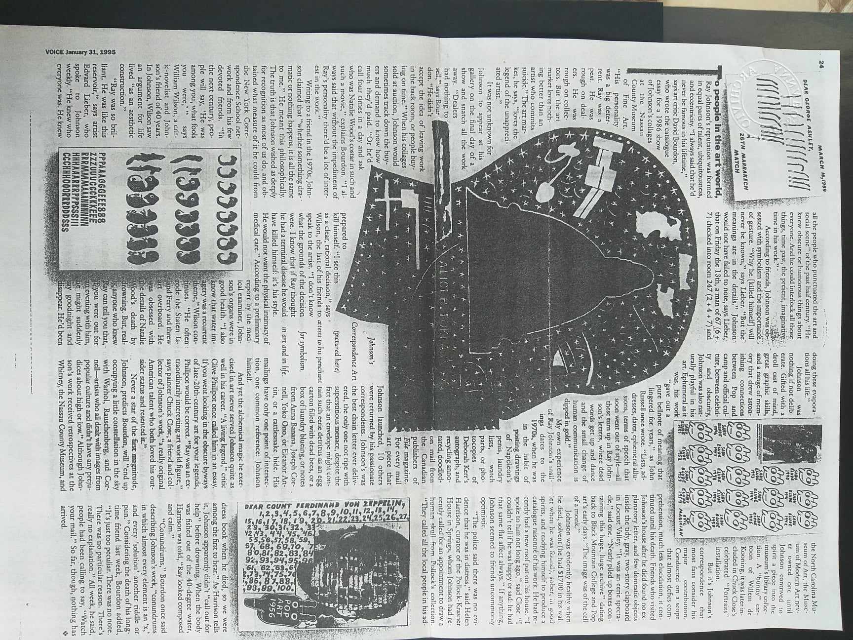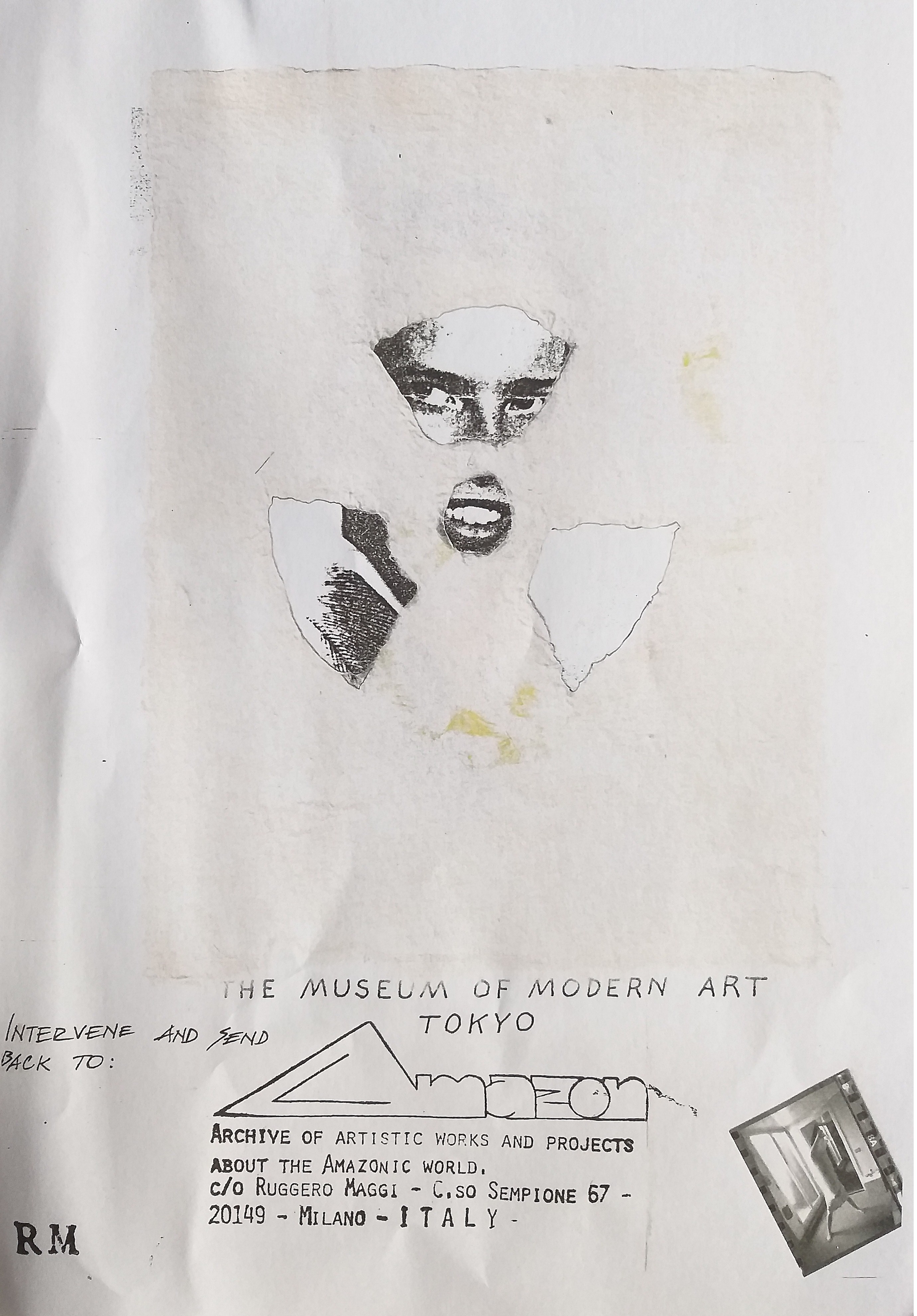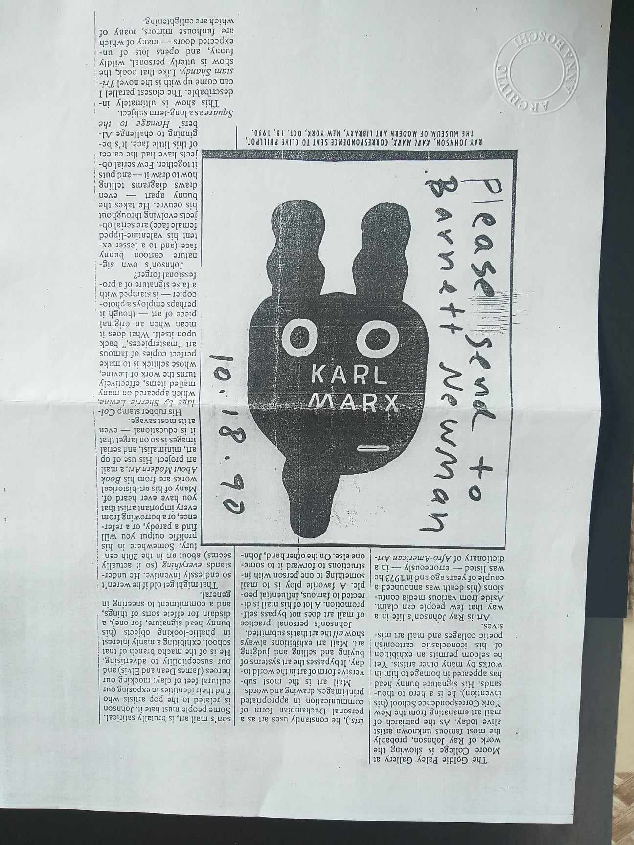 “Lo scorso ottobre 2022, ho consegnato a mano “L’ultimo autoritratto di Ray Johnson” all’Università dell’Iowa’s Alternative Traditions nell’archivio delle arti contemporanee, Iowa City, IA. (Il ritratto può essere recuperato nella casella n. 34, portafoglio n. 1). Credo che la storia del ritratto abbia qualche merito, un pezzo importante di una complicata “prestazione di morte” piena di enigmi che Johnson ha piantato negli ultimi giorni, settimane e mesi della sua vita. Il francobollo mi è stato postato dopo che ho inviato un invito personale a Ray Johnson nel 1994. La risposta di Ray è uno dei soli sei timbri d’artista fatti durante la sua vita. Il ritratto di Johnson è stato disegnato con penna nera e inchiostro, oscurando completamente lo spazio dove doveva apparire il suo volto. Forse il “niente ritratto” di Johnson era una premonizione inquietante, un riflesso del suo stato psicologico pochi mesi prima che si togliesse la vita a Sag Harbor Bridge. Il ritratto è stato realizzato da Ray su un modello di francobollo di “Netshakers”, parte di un foglio di francobollo seghettato pubblicato da AVA Gallery in “Netshaker”, Vol 3, numero n.1. Il tanto ricercato foglio artistamp è stato reso possibile grazie a una sovvenzione del 1993 del New Hampshire Council For the Arts. L’edizione offset contava 1000 fogli e comprendeva gli autoritratti di altri 99 networker di mail art.”
