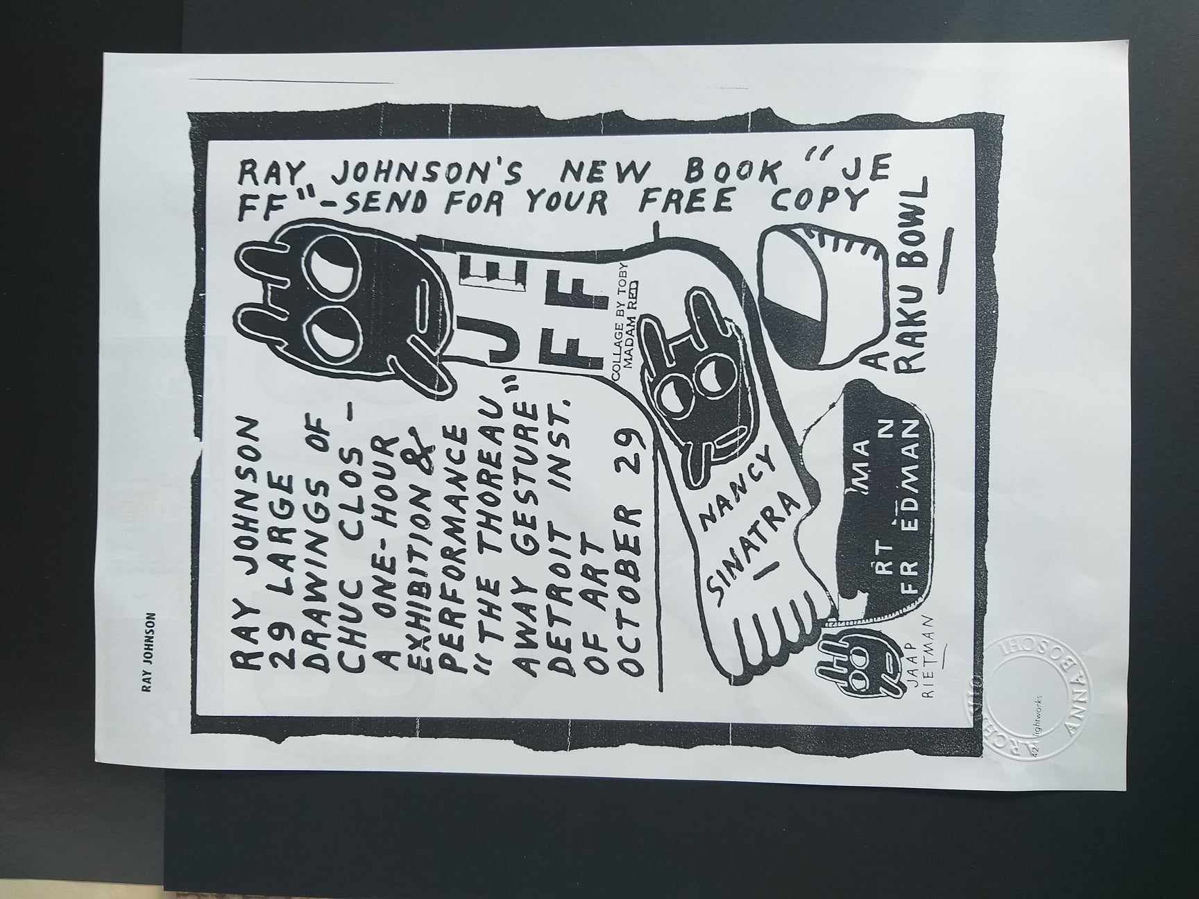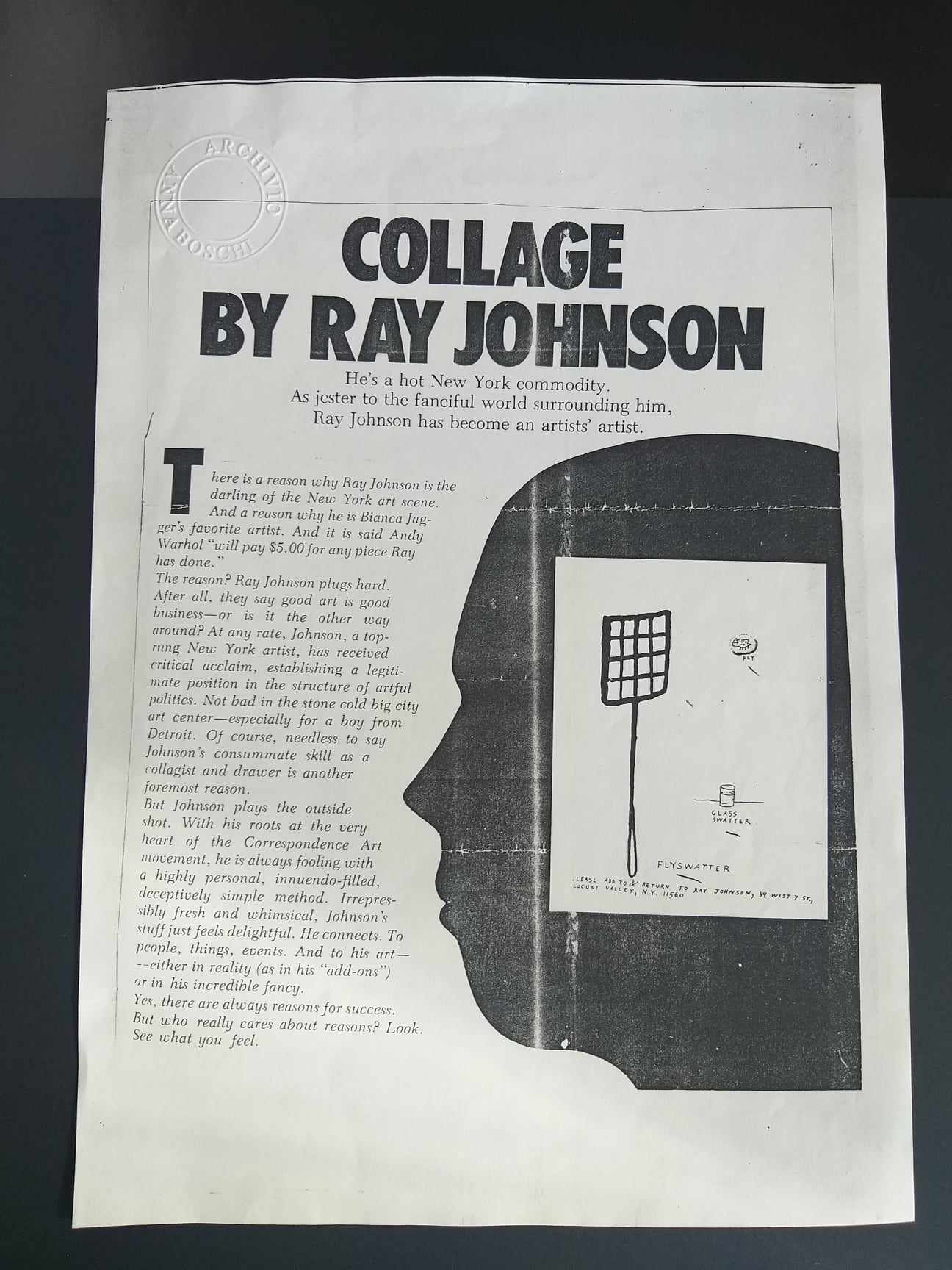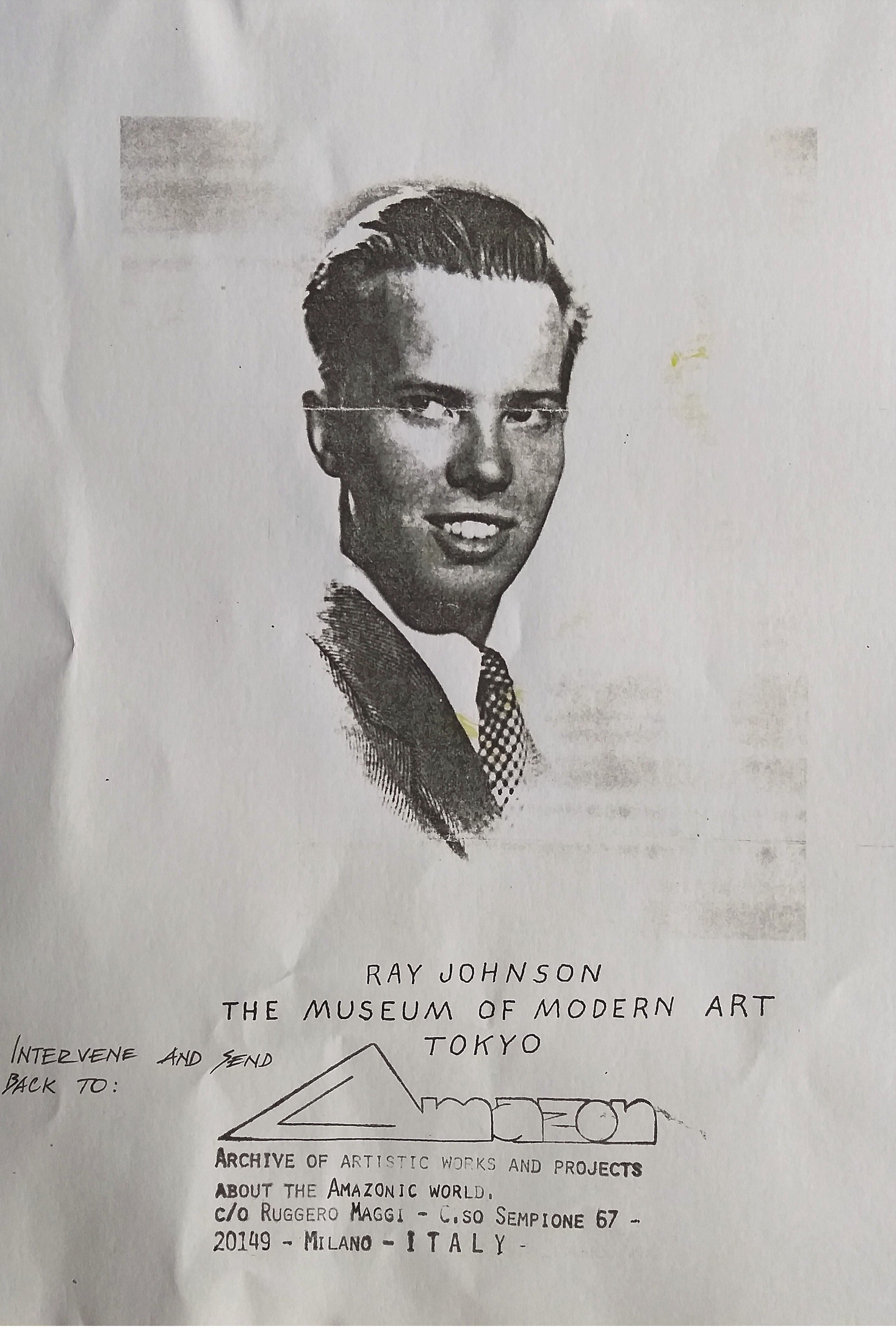 Ray Johnson è nato nel 1927 a New York dove è morto suicidanel 1995 tuffandosi nelle acque gelide del Sag Harbor di Long Island. E’ stata una figura concettuale precoce nella Pop Art del 1950 e subito dopo un pioniere della Mail Art fino ad essere definito dalla critica “il padre della Mail Art” Prediligeva la tecnica del collage, una forma d’arte tipica del XX secolo che riflette la stridente collisione tra le varie e disparate informazioni visive e verbali prodotte dall’uomo moderno soprattutto attraverso i mass-media.In questo preciso momento storico la conversazione telefonica caratterizza la ricerca di Johnson fino a diventare un’innovazione culturale perché si diffonde oltre i confini del visivo. L’artista ha messo in scena ciò che Suzi Gablik aveva descritto nella Pop Art ridefinendo il concetto primario in “primo happening informale” e trasferito subito dopo nella Mail Art con i libri d’artista, i grafich design e la scultura, ovvero lavorando simultaneamente in tutti i modi possibili. Joohnson non solo richiama il concetto che Rauschenberg definì come “Il divario tra arte e vita”, ma anche cancellato se vogliamo la distinzione tra di loro. Il suo modo di essere è il riflesso della sua mente ossessivamente creativa che sfocia in una continua “opera d’arte”. Le sue opere riflettono la sua erudizione enciclopedica, la sua gamma promiscua di interessi e di una straordinaria capacità nello scoprire le connessioni tra una miriade di immagini, fatti e persone. Nato a Detroit, Michigan il 16 ottobre 1927, Johnson è cresciuto in quartiere popolare e ha frequentato una scuola professionale dove si programmava la pubblicità d’arte. Ha studiato presso l’Art Institute di Detroit nel 1945, si iscrive subito dopo al Black Mountain College dova trascorre tre anni. Ha studiato pittura con gli ex doventi del Bauhaus Josef Albers s Lyonel Feininger, così come con Robert Motherwell. Nell’estate del 1948 aveva fatto amicizia con Merce Cunningham, Willelm de Koning, Buckminster Fuller e Richard Lippold e Ruth Asawa tutti questi erano docenti venuti in visita da John Cage (caratterizzata dallo studioso Martin Duberman come “un evento spartiacque nella storia della tecnica mista” proprio con Cage) Nei primi mesi del 1949, Johnson si trasferisce a New York City ed è diventato un partecipante attivo nella scena downtown art accanto a al gruppo astratto Artisti Americani. Dipinge astrazioni geometriche altamente influenzate dalle immagini del suo ex professore Josef Albers. In questo periodo distrugge la maggior parte di questi lavori e si dedica al collage. Nel 1954, Johnson crea i “moticos” collage silouette di forma irregolare di piccole dimensioni sul quale incolla immagini dei personaggi che Warhol richiamerà nella Pop Art nel 1960. Tuttavia il suo atteggiamento verso la fama è rimasta proprio l’antitesi di Warhol. Egli continuamente lo schivò e fu soprannominato per questo motivo “Il più famoso artista sconosciuto” da Grace Glueck in un New York Times del 1965 con cui ha discusso della sua inafferrabilità deliberata. Johnson è considerato un alchimista artistico che potrebbe trasformare i detriti della vita ordinaria in proverbiale arte oppure in “oro”. Nel suo tipico modo autoironico, Johnson avrebbe detto che lui non ha fatto Pop Art ma “Art Chop”. (Arte tritata) Nel 1958 fu riconosciuto come parte della nascente generazione Pop.In una revisione espositiva di Jasper Johns, un critico per Artnews ha dichiarato: “Johnson è il primo one-man show” e lo poneva tra i colleghi più noti come Rauscenberg, Trwombly, Kaprow”. Nel 1959 johnson ha incontrato Billy Linich (più tardi conosciuto come Billy Name) al Serendipity di New Yorke nel 1963 lo presentò a Warhol. Billy Name divenne una figura chiave nella Factory di Warhol, responsabile per il rivestimento di pareti di fabbrica in argento, un’idea che ha accreditato Johnson come uno dei primi concettuali, un erede di Marcel Duchamp (poteva averlo incontrato nel 1961) condividendo il suo entusiasmo per il lavoro del francese anziano con molti dei suoi contemporanei. Nell’opera di Marcel Duchamp “Etant donnés” Michael Taylor osserva: “L’esposizione pubblica del lavoro di Johnson ha contribuito a collocare lui come una figura cruciale nella diffusione della second guerra post-.mondiale di arte e di idee di Ducamp accanto a luminari culturali come John Cage, Merce Cunningham e Jasper John. Johnson è stato uno degli artisti chiave perché partecipava attivamente ai lavori d’arte. Il suo interesse per i codici, le poetiche e i sistemi semiotici di Duchamp anticipano pratiche culturali del XX secolo”. Durante tutta la fase iniziale della sua carriera Johnson cercò il casuale e l’effimero, incorporando operazioni casuali nella sua poetica artistica della “mail art”. Egli si costruì gradualmente una rete informale ibrida di amici, conoscenti e sconosciuti con il quale ha scambiato idee e opere d’arte attraverso il sistema postale. Nel 1958 cominciò a scrivere: Si prega di inviare a…” sulle sue spedizioni, creando così automaticamente ancora più sotto-reti tra le centinaia di corrispondenti nella sua maggiore organizzazione, la Mail Art. Nel 1962 la “Correspondance School di New York”, (la sua “scuola” virtuale di corrispondenti) era diventata una rete cartacea pronta per una rete di comunicazione elettronica più immediata e più veloce e inevitabilmente alla fine si diffuse non solo in tutta la nazione ma in tutto il mondo. Johnson era un istigatore di performance art. Partecipava attivamente alle manifestazioni di James Waring e Susan Kaufman, tra gli altri mettendo in scena ed evidenziando la sua partenza artistica dal 1957 commentata da “Musica funebre per Elvis Presley e Lezione sulla musica moderna” .Le composizioni di Jhonson erano eseguite presso il Living Theatre o durante eventi come il Fluxus “Festival Yam” del 1963. Dal