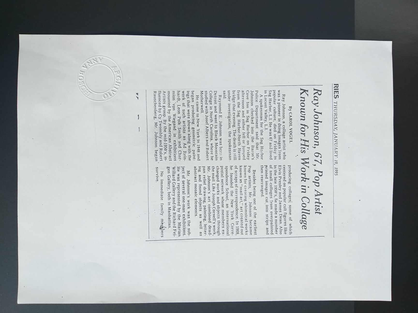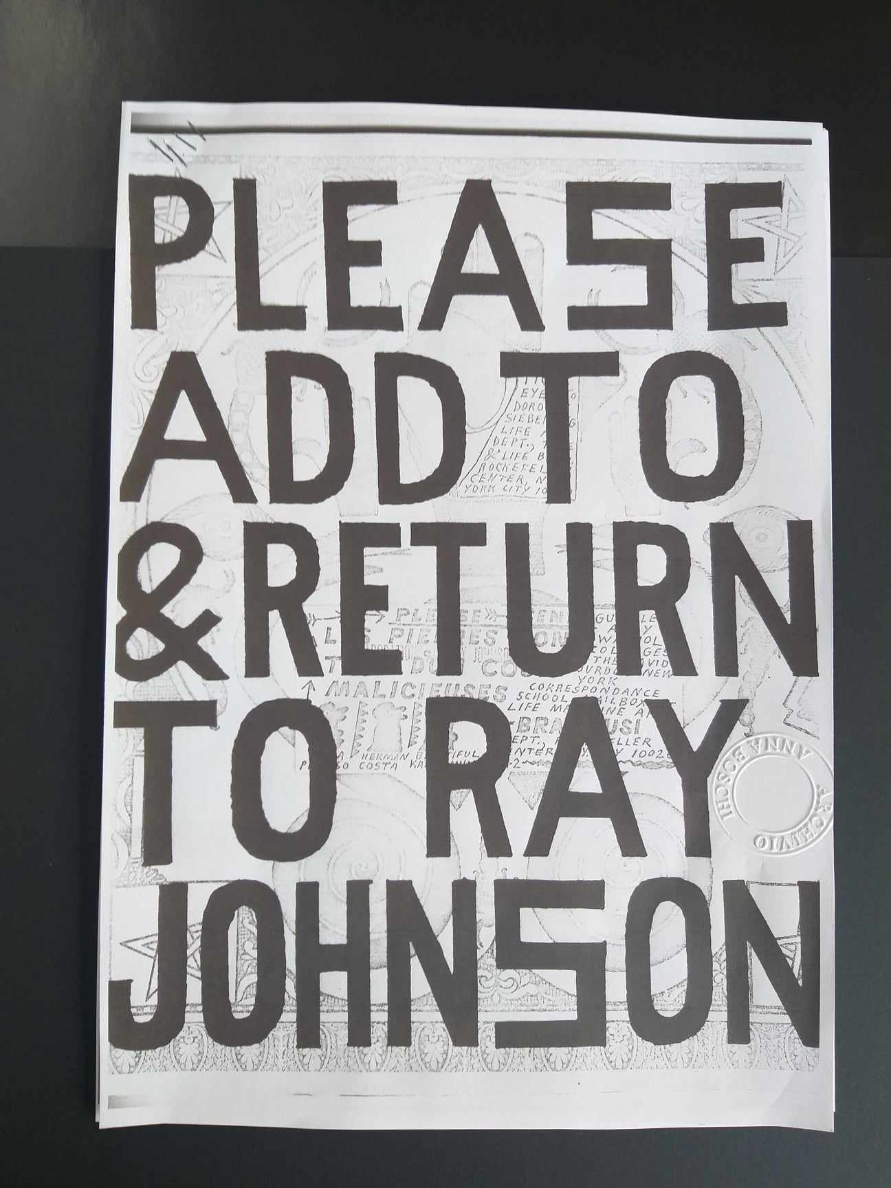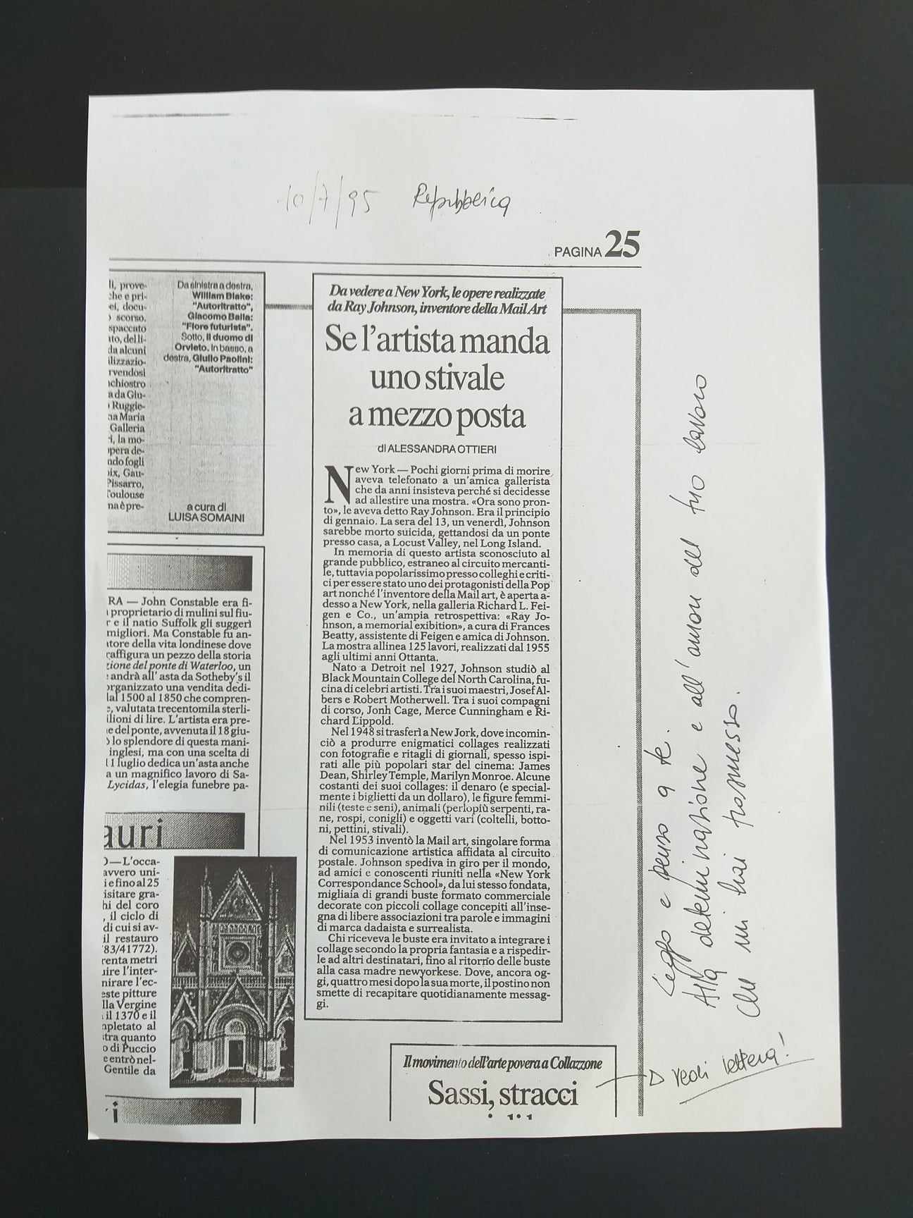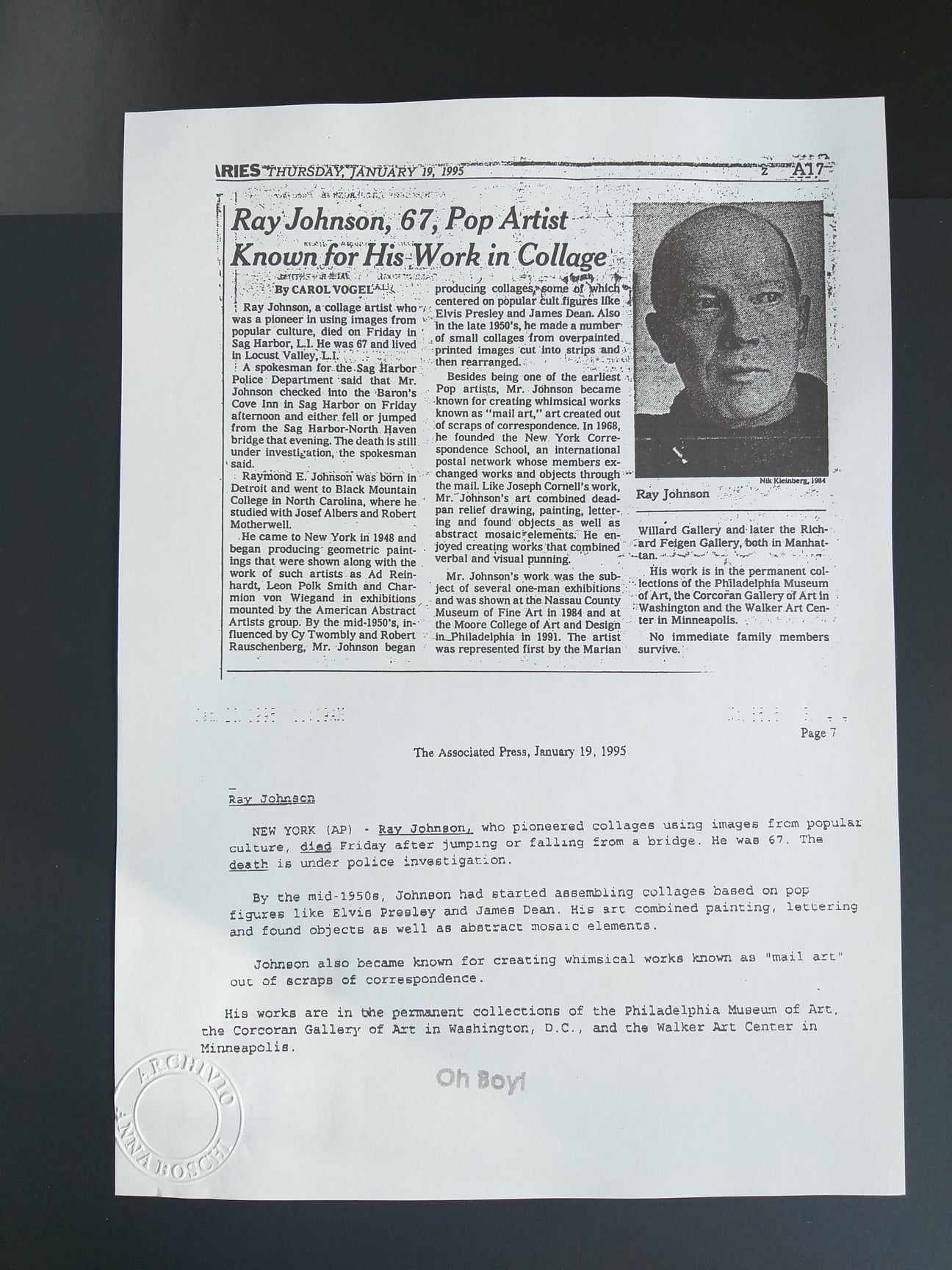 Ray Johnson è nato nel 1927 a New York dove è morto suicidanel 1995 tuffandosi nelle acque gelide del Sag Harbor di Long Island. E’ stata una figura concettuale precoce nella Pop Art del 1950 e subito dopo un pioniere della Mail Art fino ad essere definito dalla critica “il padre della Mail Art” Prediligeva la tecnica del collage, una forma d’arte tipica del XX secolo che riflette la stridente collisione tra le varie e disparate informazioni visive e verbali prodotte dall’uomo moderno soprattutto attraverso i mass-media.In questo preciso momento storico la conversazione telefonica caratterizza la ricerca di Johnson fino a diventare un’innovazione culturale perché si diffonde oltre i confini del visivo. L’artista ha messo in scena ciò che Suzi Gablik aveva descritto nella Pop Art ridefinendo il concetto primario in “primo happening informale” e trasferito subito dopo nella Mail Art con i libri d’artista, i grafich design e la scultura, ovvero lavorando simultaneamente in tutti i modi possibili. Joohnson non solo richiama il concetto che Rauschenberg definì come “Il divario tra arte e vita”, ma anche cancellato se vogliamo la distinzione tra di loro. Il suo modo di essere è il riflesso della sua mente ossessivamente creativa che sfocia in una continua “opera d’arte”. Le sue opere riflettono la sua erudizione enciclopedica, la sua gamma promiscua di interessi e di una straordinaria capacità nello scoprire le connessioni tra una miriade di immagini, fatti e persone. Nato a Detroit, Michigan il 16 ottobre 1927, Johnson è cresciuto in quartiere popolare e ha frequentato una scuola professionale dove si programmava la pubblicità d’arte. Ha studiato presso l’Art Institute di Detroit nel 1945, si iscrive subito dopo al Black Mountain College dova trascorre tre anni. Ha studiato pittura con gli ex doventi del Bauhaus Josef Albers s Lyonel Feininger, così come con Robert Motherwell. Nell’estate del 1948 aveva fatto amicizia con Merce Cunningham, Willelm de Koning, Buckminster Fuller e Richard Lippold e Ruth Asawa tutti questi erano docenti venuti in visita da John Cage (caratterizzata dallo studioso Martin Duberman come “un evento spartiacque nella storia della tecnica mista” proprio con Cage) Nei primi mesi del 1949, Johnson si trasferisce a New York City ed è diventato un partecipante attivo nella scena downtown art accanto a al gruppo astratto Artisti Americani. Dipinge astrazioni geometriche altamente influenzate dalle immagini del suo ex professore Josef Albers. In questo periodo distrugge la maggior parte di questi lavori e si dedica al collage. Nel 1954, Johnson crea i “moticos” collage silouette di forma irregolare di piccole dimensioni sul quale incolla immagini dei personaggi che Warhol richiamerà nella Pop Art nel 1960. Tuttavia il suo atteggiamento verso la fama è rimasta proprio l’antitesi di Warhol. Egli continuamente lo schivò e fu soprannominato per questo motivo “Il più famoso artista sconosciuto” da Grace Glueck in un New York Times del 1965 con cui ha discusso della sua inafferrabilità deliberata. Johnson è considerato un alchimista artistico che potrebbe trasformare i detriti della vita ordinaria in proverbiale arte oppure in “oro”. Nel suo tipico modo autoironico, Johnson avrebbe detto che lui non ha fatto Pop Art ma “Art Chop”. (Arte tritata) Nel 1958 fu riconosciuto come parte della nascente generazione Pop.In una revisione espositiva di Jasper Johns, un critico per Artnews ha dichiarato: “Johnson è il primo one-man show” e lo poneva tra i colleghi più noti come Rauscenberg, Trwombly, Kaprow”. Nel 1959 johnson ha incontrato Billy Linich (più tardi conosciuto come Billy Name) al Serendipity di New Yorke nel 1963 lo presentò a Warhol. Billy Name divenne una figura chiave nella Factory di Warhol, responsabile per il rivestimento di pareti di fabbrica in argento, un’idea che ha accreditato Johnson come uno dei primi concettuali, un erede di Marcel Duchamp (poteva averlo incontrato nel 1961) condividendo il suo entusiasmo per il lavoro del francese anziano con molti dei suoi contemporanei. Nell’opera di Marcel Duchamp “Etant donnés” Michael Taylor osserva: “L’esposizione pubblica del lavoro di Johnson ha contribuito a collocare lui come una figura cruciale nella diffusione della second guerra post-.mondiale di arte e di idee di Ducamp accanto a luminari culturali come John Cage, Merce Cunningham e Jasper John. Johnson è stato uno degli artisti chiave perché partecipava attivamente ai lavori d’arte. Il suo interesse per i codici, le poetiche e i sistemi semiotici di Duchamp anticipano pratiche culturali del XX secolo”. Durante tutta la fase iniziale della sua carriera Johnson cercò il casuale e l’effimero, incorporando operazioni casuali nella sua poetica artistica della “mail art”. Egli si costruì gradualmente una rete informale ibrida di amici, conoscenti e sconosciuti con il quale ha scambiato idee e opere d’arte attraverso il sistema postale. Nel 1958 cominciò a scrivere: Si prega di inviare a…” sulle sue spedizioni, creando così automaticamente ancora più sotto-reti tra le centinaia di corrispondenti nella sua maggiore organizzazione, la Mail Art. Nel 1962 la “Correspondance School di New York”, (la sua “scuola” virtuale di corrispondenti) era diventata una rete cartacea pronta per una rete di comunicazione elettronica più immediata e più veloce e inevitabilmente alla fine si diffuse non solo in tutta la nazione ma in tutto il mondo. Johnson era un istigatore di performance art. Partecipava attivamente alle manifestazioni di James Waring e Susan Kaufman, tra gli altri mettendo in scena ed evidenziando la sua partenza artistica dal 1957 commentata da “Musica funebre per Elvis Presley e Lezione sulla musica moderna” .Le composizioni di Jhonson erano eseguite presso il Living Theatre o durante eventi come il Fluxus “Festival Yam” del 1963. Dal