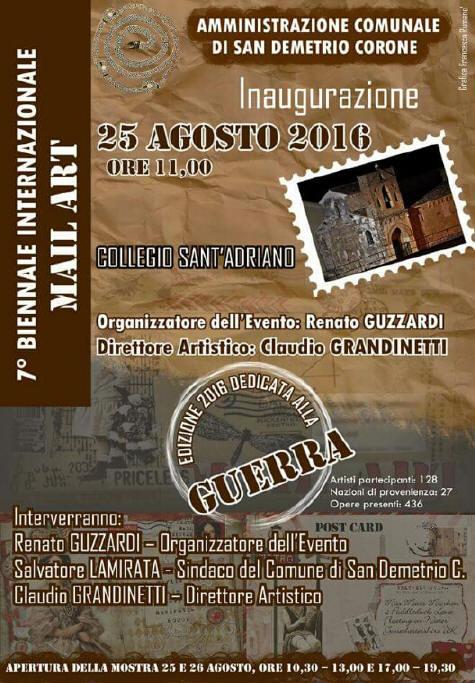 Il 26 Agosto 2016 alle ore 20,00 si è conclusa con successo e con una grande affluenza di pubblico la VIIª Biennale Internazionale Mail Art. Ancora una volta la location scelta dallo Studio Guzzardi è stata San Demetrio Corone (CS) ridente località culturale di rito Arbëreshë (Greco-Bizantino) nel collegio della bellissima Chiesa basiliano-normanna di Sant’Adriano. Il tema proposto il 2016 è stato quello sconcertante della Guerra e quindi delle varie assurde atrocità che l’uomo manifesta oramai quotidianamente sui suoi simili senza distinzione di razza, cultura, religione ne tanto meno età o alcuna ragione o giustificazione comprensibile. Gli artisti di 27 nazioni hanno manifestato il loro disdegno inviando bellissime opere con slogan toccanti e a volte disarmanti per i visitatori presenti al vernissage ed alla conferenza stampa dove sono intervenuti il sindaco di San Demetrio Salvatore Lamirata, il Prof. Renato Guzzardi e l’artista e Direttore Artistico della manifestazione Claudio Grandinetti. Nella stessa conferenza l’imprescindibile dissenso alla guerra è stato unanime. Come nelle Biennali precedenti è doveroso citare tra i circa 200 artisti partecipanti e in particolar modo nelle news entries Otto Sherman. Tutte le nazioni celebrano i loro leader efferati, così il compito di Otto è stato quello di rendere evidente e naturale che tutti i governanti che hanno avuto potere, sono stati in realtà dei disonesti. Sherman ora vive a New York City e non poteva esimersi da partecipare a questa Biennale. La sua satira oggi è sempre più pungente. Un altro artista americano John Held Jr. autore e anche performer da noi citato perché è stato un mailartist attivo anche nell’ arte alternativa dal 1975, in particolare nei settori del timbro di gomma arte, zine della cultura, e artistamps. Egli è uno dei promotori e dei cronisti più importanti e rispettati nella Mail Art. Il duo Rora & Dobrica Kamperelic pittori e performers serbi che hanno già conosciuto tra l’altro i risultati nefasti della guerra, hanno finalmente accettato il nostro invito e faranno parte anche del nostro Archivio Mail Art. L’olandese Rod Summers per questa Biennale ha inteso spedirci una bellissima poesia. Il tedesco Reiner Langer artista e poeta grande creatore di immagini fantastiche che ha giocato la sua vita nella spasmodica ricerca espressività attraverso la meticolosa composizione di forme, immagini e segni producendo grandi opere originali ci ha spedito una serie bellissima del suo prezioso operato. Tra gli assidui e stimati artisti che da tempo ci supportano e di cui ci pregiano della loro cultura segnaliamo: Clemente Padin, John M. Bennett, Michael Goetz, Günes Sinasi, Peter Willi Kaufmann, Cesar Reglero, Miguel Jimenez, Pedro Bericat, Beatriz Albuquerque, Piet Franzen Sidac, Jaromir Svozilik, Nuria Montoya, Keith Bates, Simon Warren, Ryosuke Cohen, Keiichi Nakamura, Susannia Lakner, Elke Grundmann, Peter Müller, Lars Schumacher, Henning Mittendof, Susanne Müller Baji, Horst Tress, Jürgen O. Olbrich, Willemien Visser, Christian Alle, Julien Blaine, Michel Della Vedova, Anja Mattila-Tolvanen, Marina Salmaso, Horst Baur, Mailarta, Snappy Studio J, Dórian Ribas Marinho. Hugo Pontes, Wilhelm Schramm, Hilda Paz, Luis Morado, Rosa Gravino, Raquel Gociol, Silvio De Gracia, e gli italiani Vittore Baroni, Lancillotto Bellini, Giovanni Bonanno, Lamberto Caravita, Bruno Chiarlone, Maria Credidio, Daniele Davalli, Adolfina De Stefani, Marcello Diotallevi, Ivana Ferraro, Nicola Frangione, Gruppo Sinestetico, Carlo Iacomucci, Ruggero Maggi, Francesco Mandrino, Antonello Mantovani, Calogero Marrali, Diego Minuti, Francesco Minuti, Emilio Morandi, Antonella Prota Giurleo, Roberto Scala, Claudio Romeo, Fulgor C. Silvi, Renata e Giovanni Stra DA DA, Domenico Severino, Cem Demir, Serse Luigetti e Giancarlo Pucci.